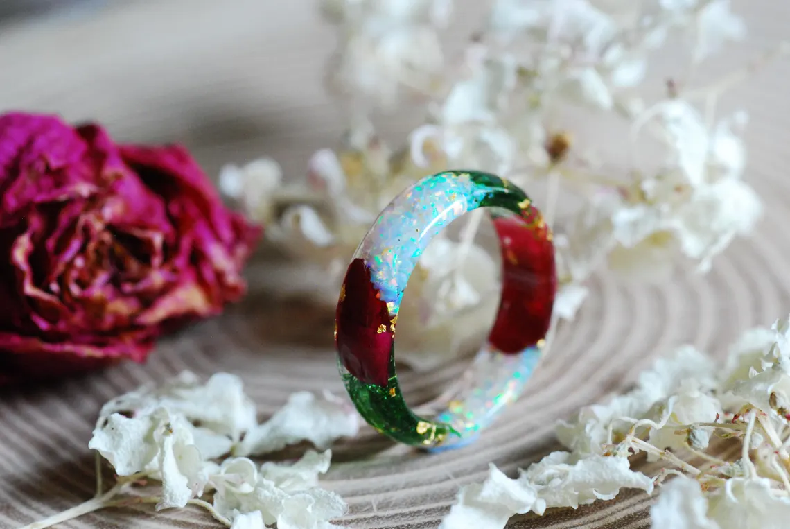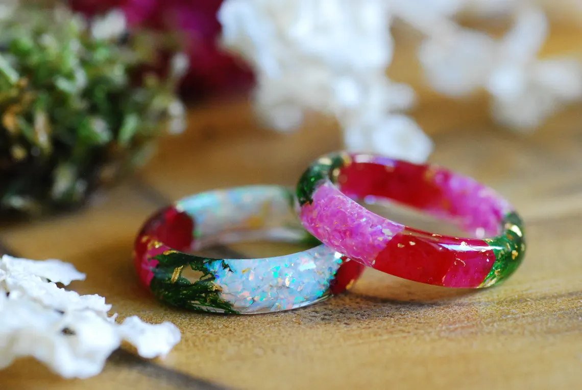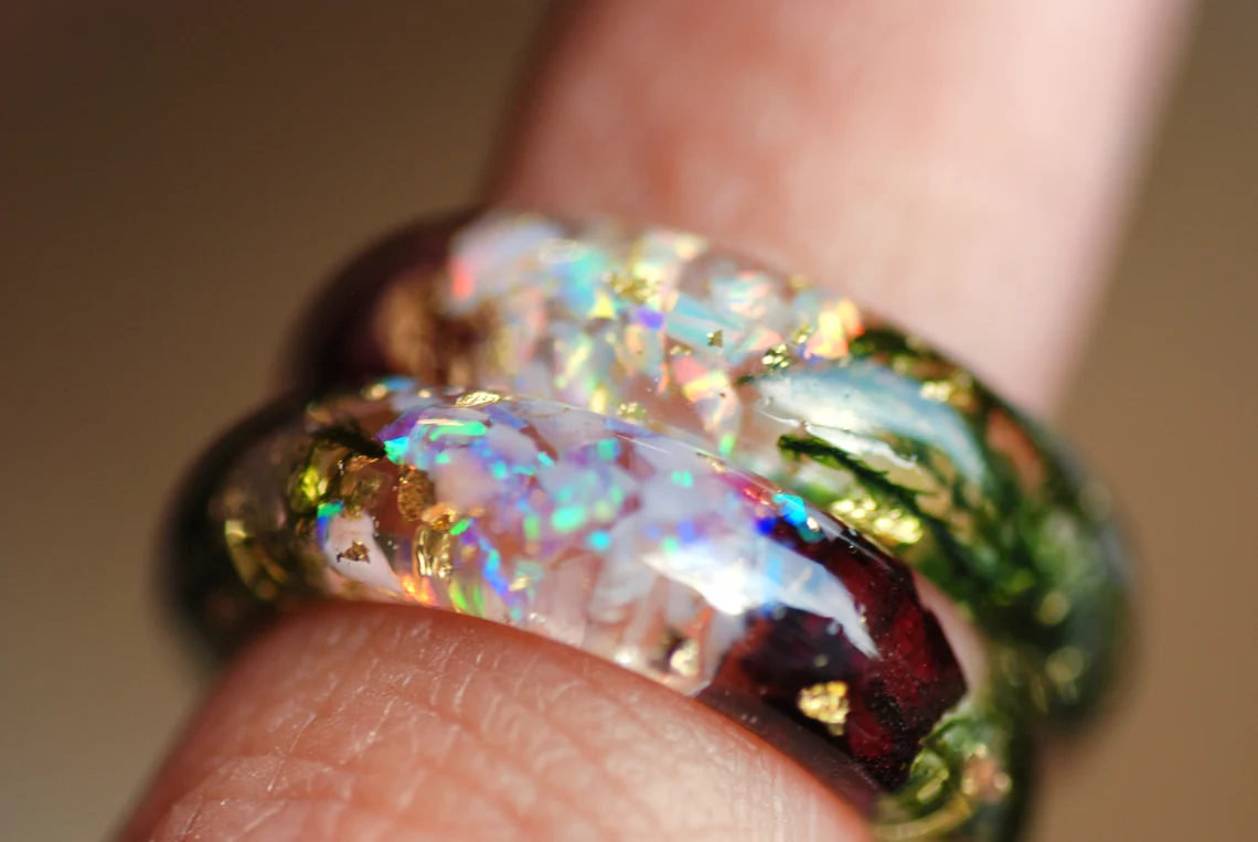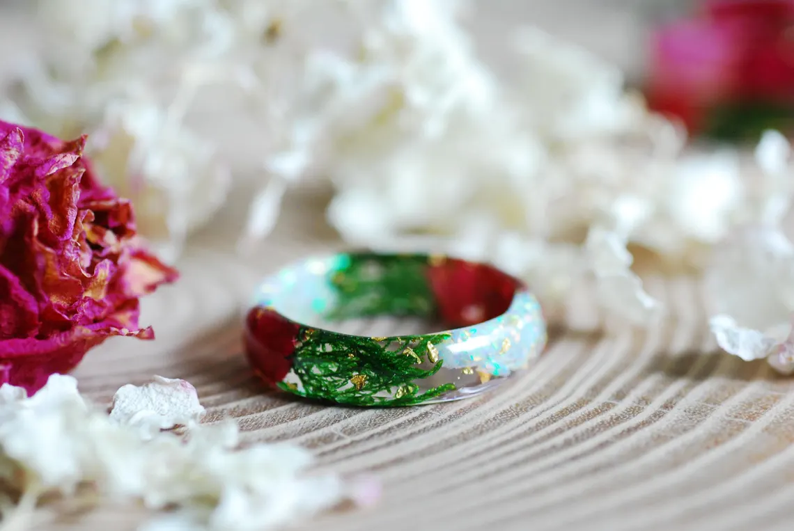 This beautiful sparkling fire opal ring made with red rose petals is made with lab opal gemstones and flowers from our garden accompanied by real green moss and 24k gold flakes in a thin rounded band of Clear Resin.