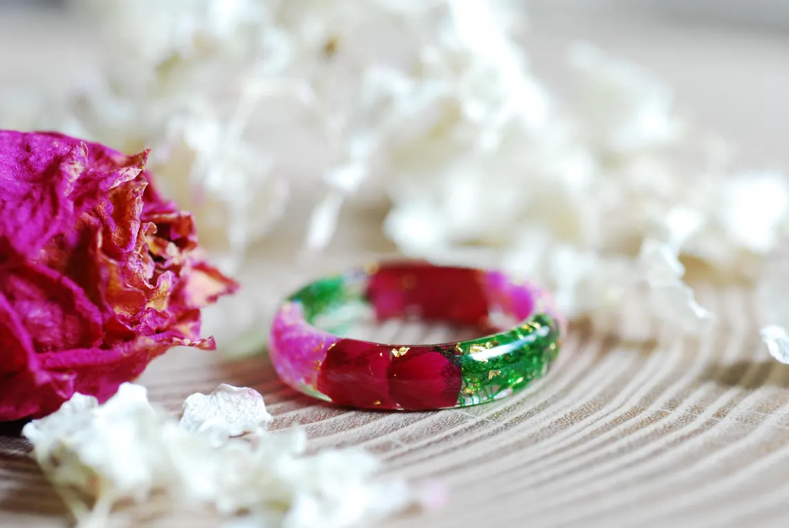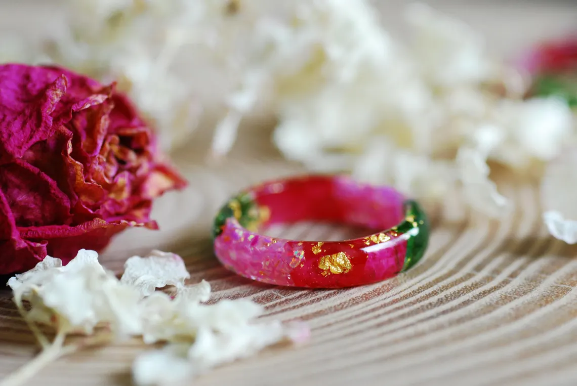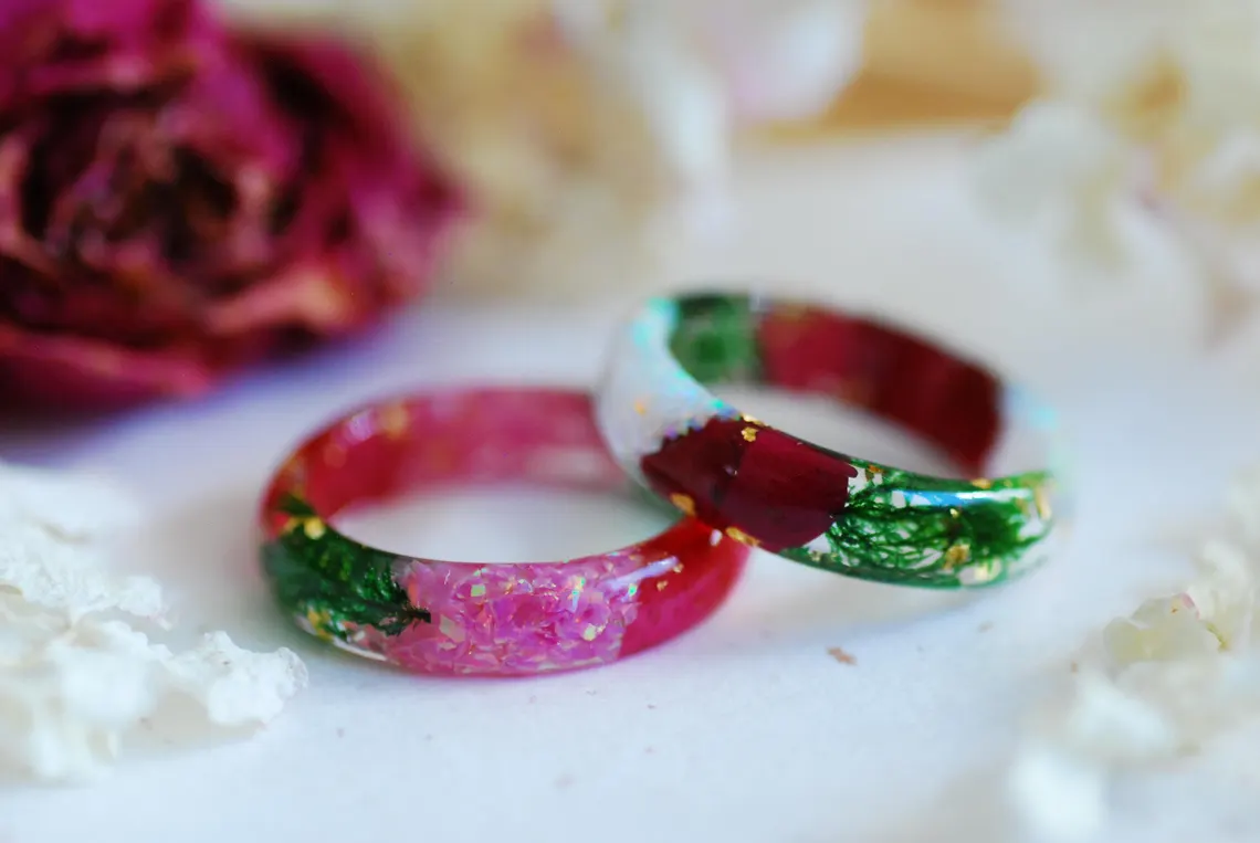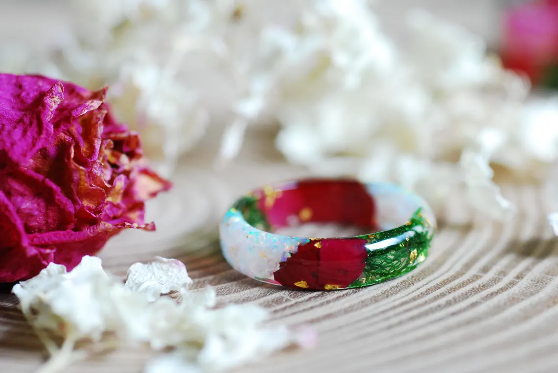 This beautiful sparkling fire opal ring made with red rose petals is made with lab opal gemstones and flowers from our garden accompanied by real green moss and 24k gold flakes in a thin rounded band of Clear Resin.