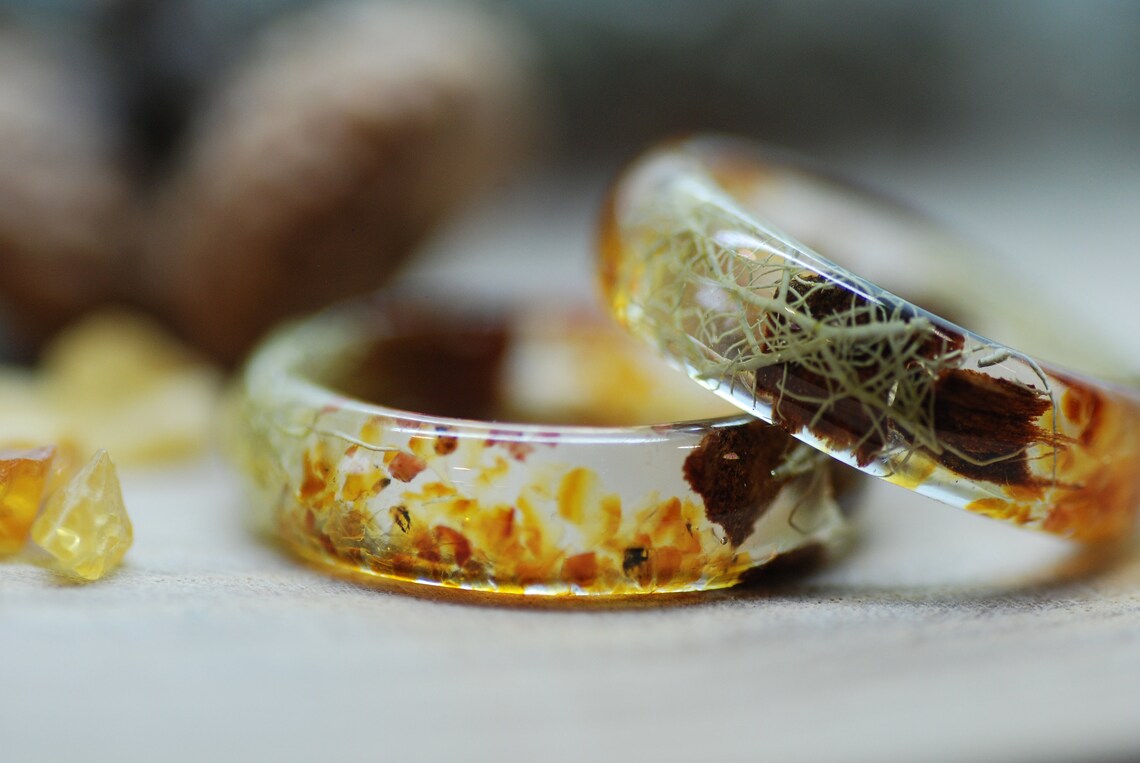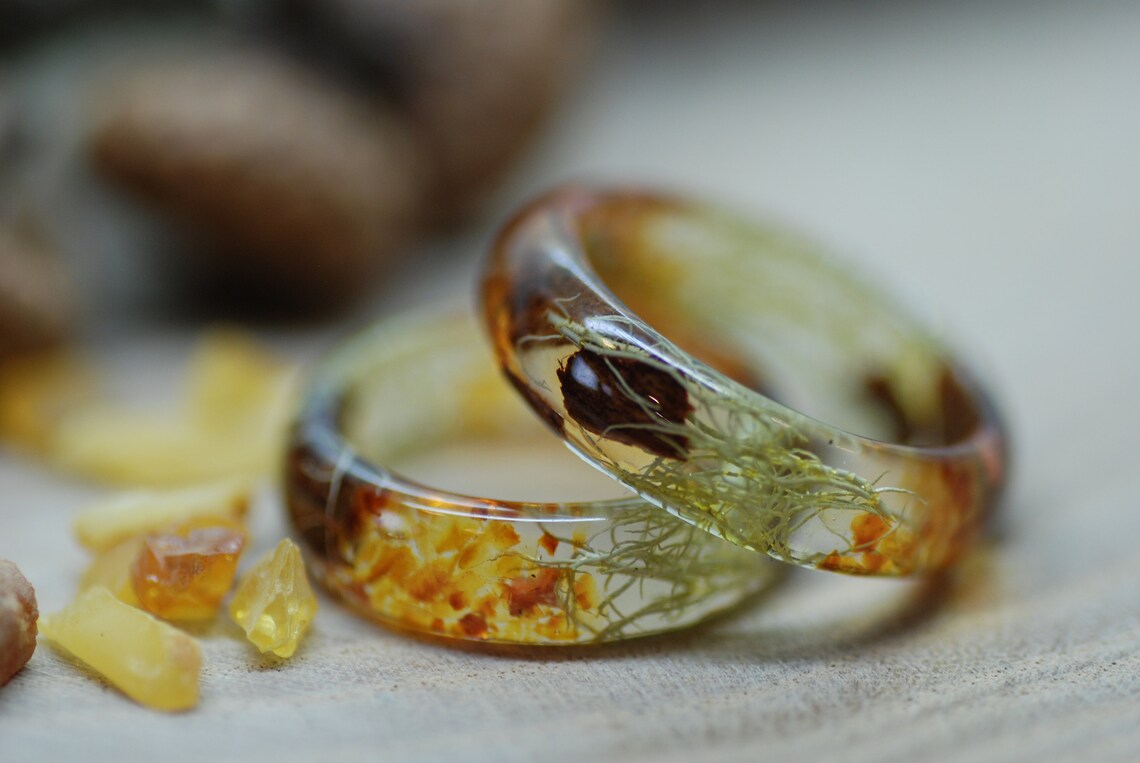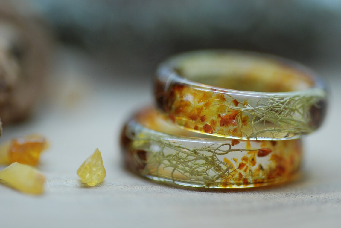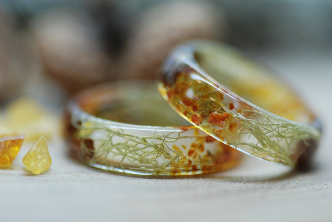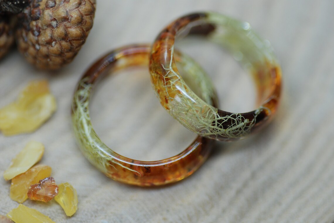 Beautiful forest ring with amber lichen and pine cones exudes a warm, earthy charm that immediately transports you to the enchanting embrace of a forest.