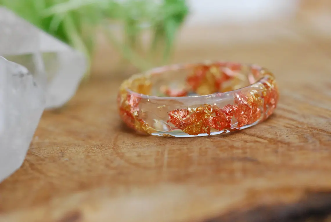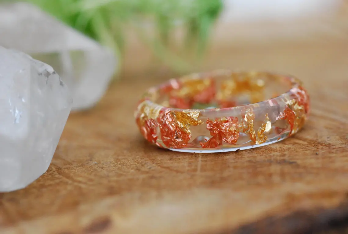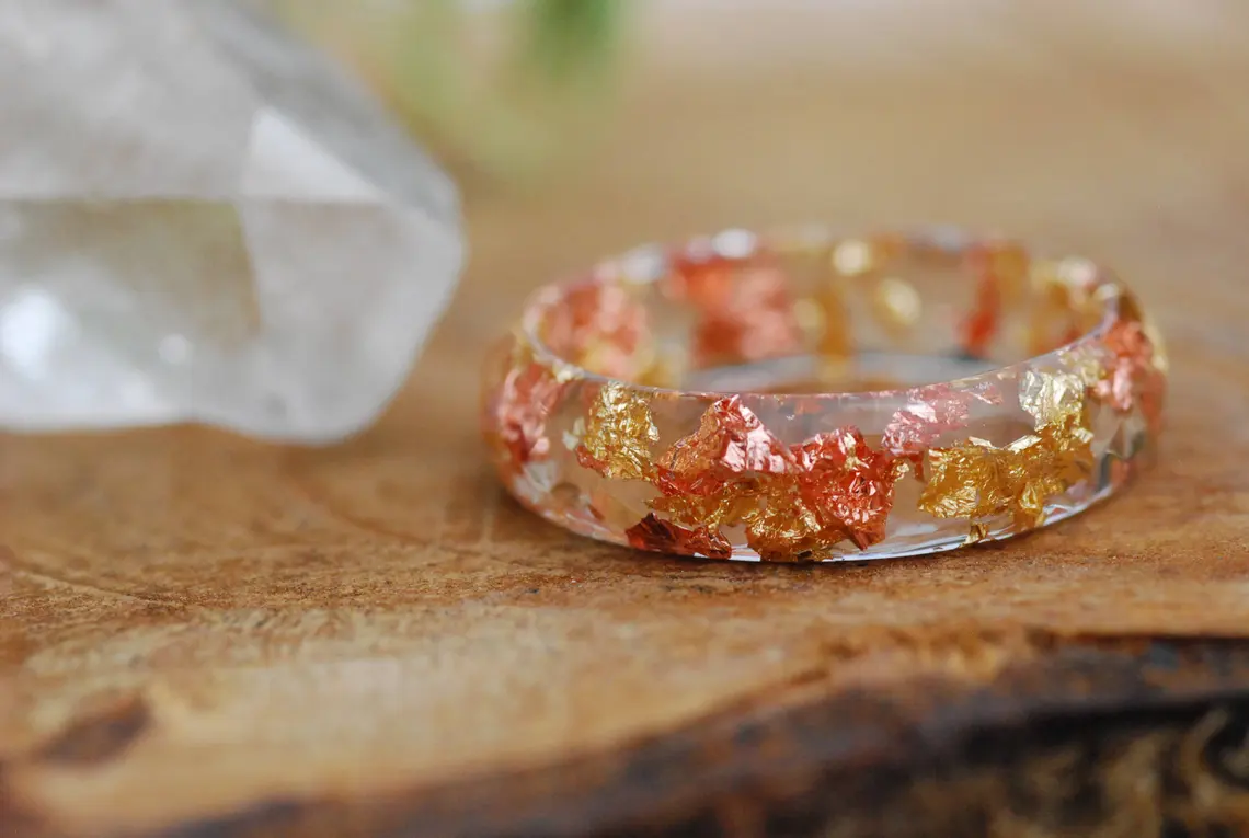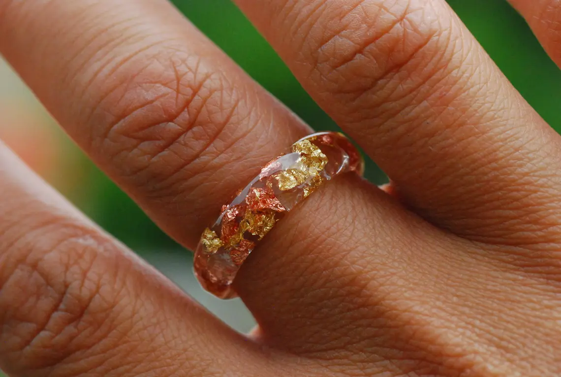 Each ring is unique, made with no pigments, just gold and copper flakes suspended in the resin.