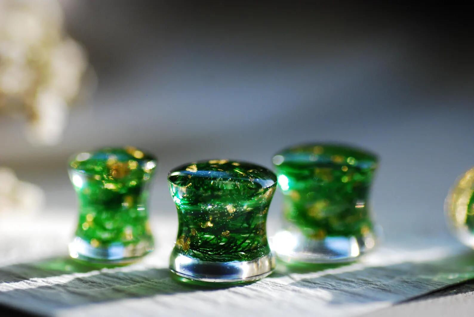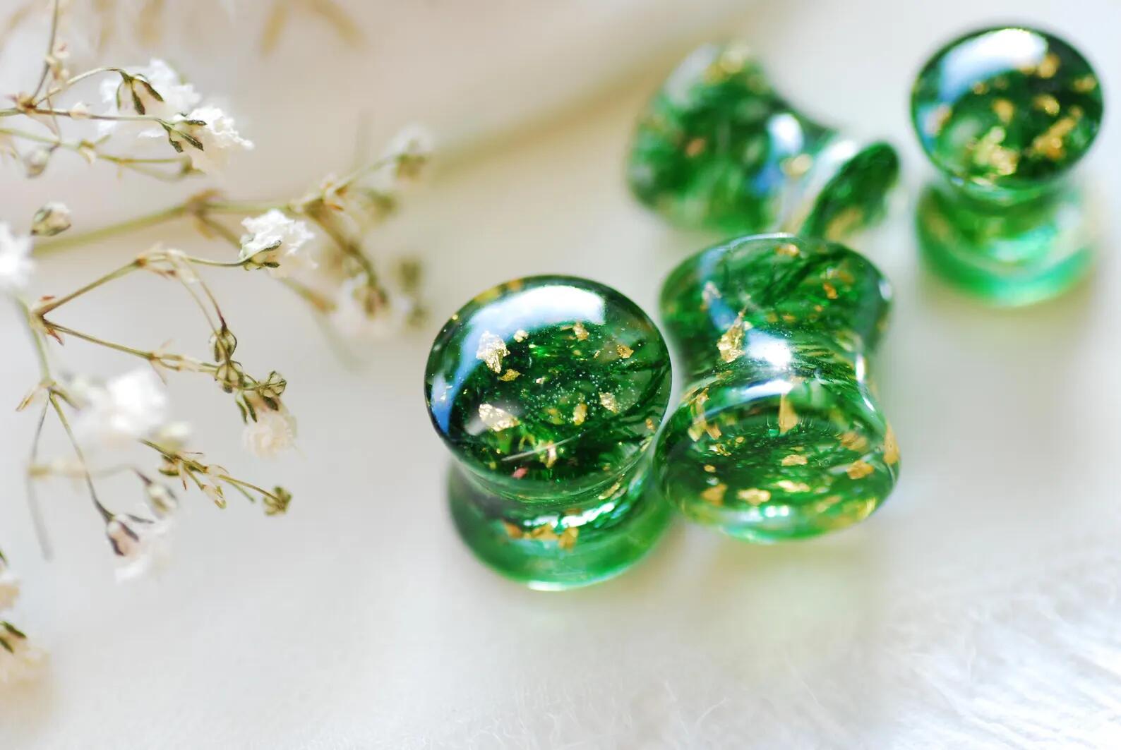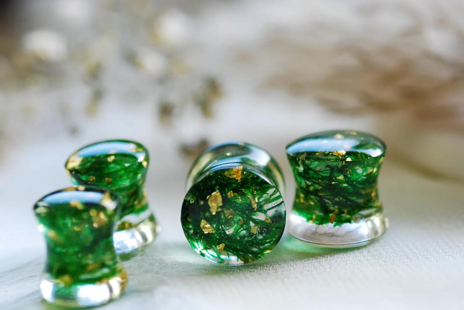 These double-flared gold and moss gauges are handmade using real green moss plants that I pick from the forest and preserve in our studio in Poland, with 24k gold flakes suspended in clear resin.