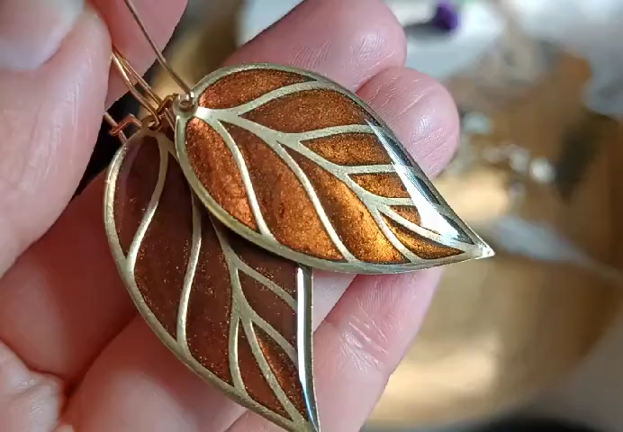 These autumn-styled and eye-catching dangle gold leaf earrings change color depending on the light. They will shift the color from copper metallic to different shades of brown, from light to dark.