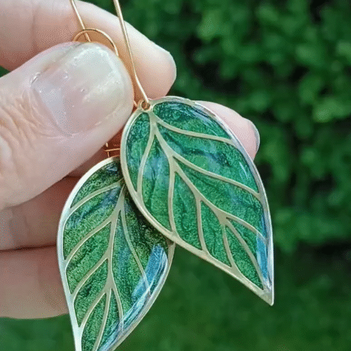 These stunning and eye-catching dangling green leaf earrings change color depending on the light. They will shift the color from teal blue to different shades of green, from light to dark green.