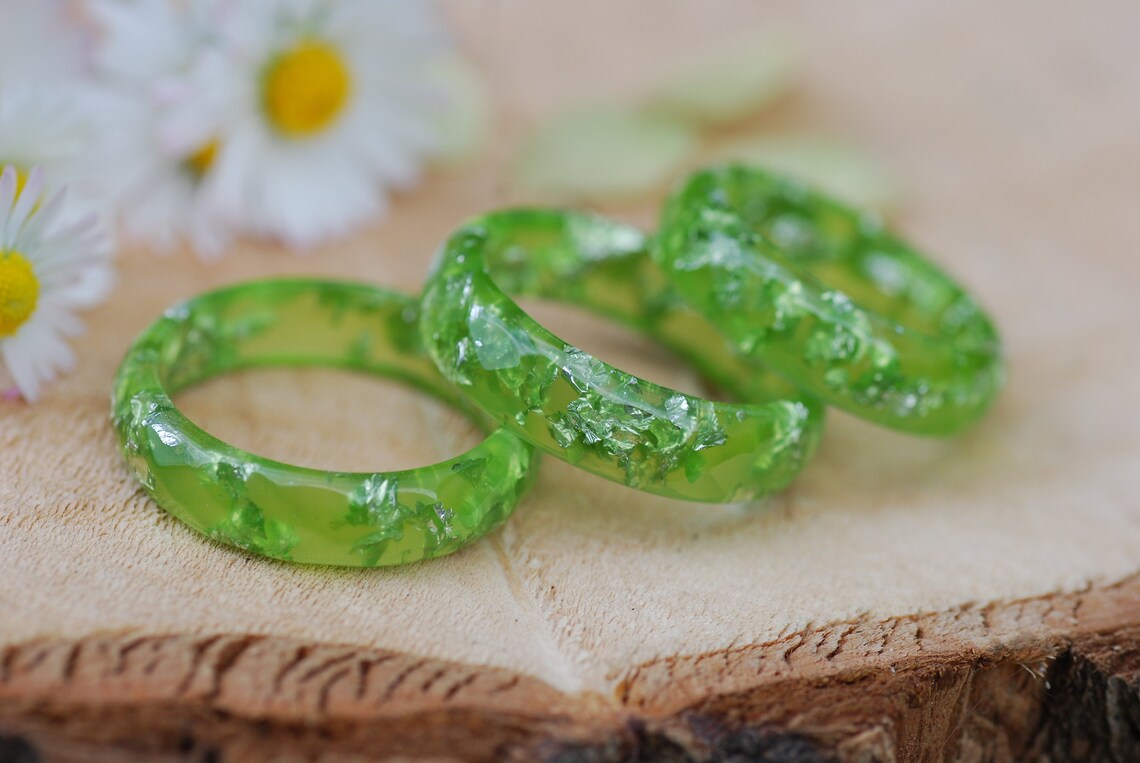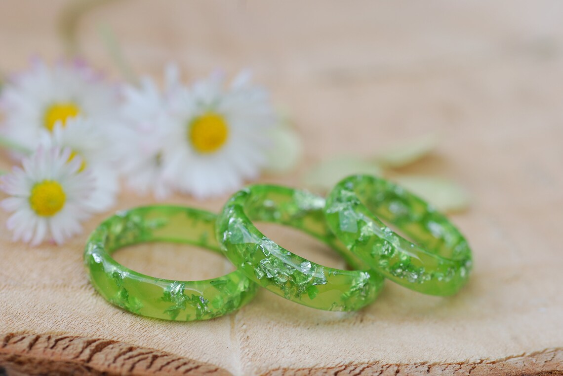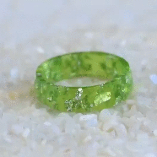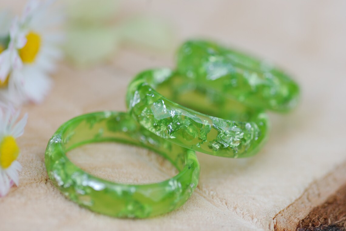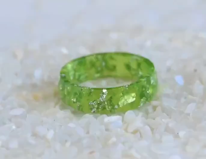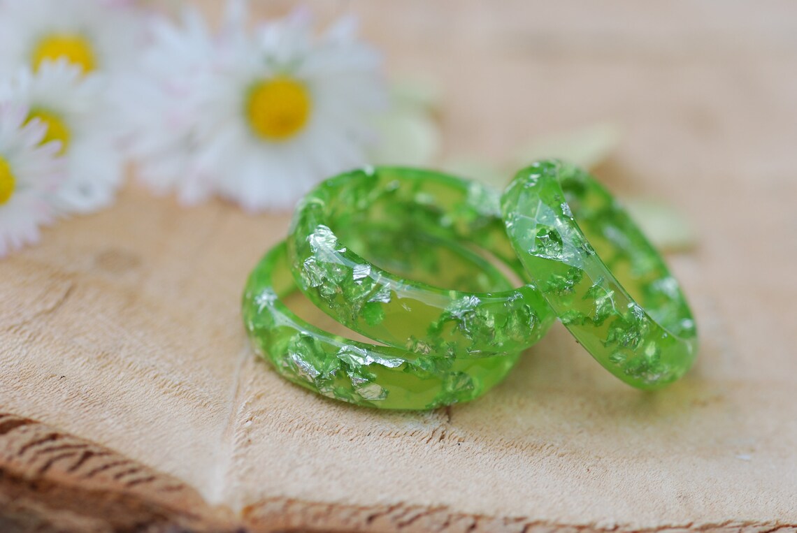 Each ring is unique, made with lime green pigments and silver flakes suspended in the resin.