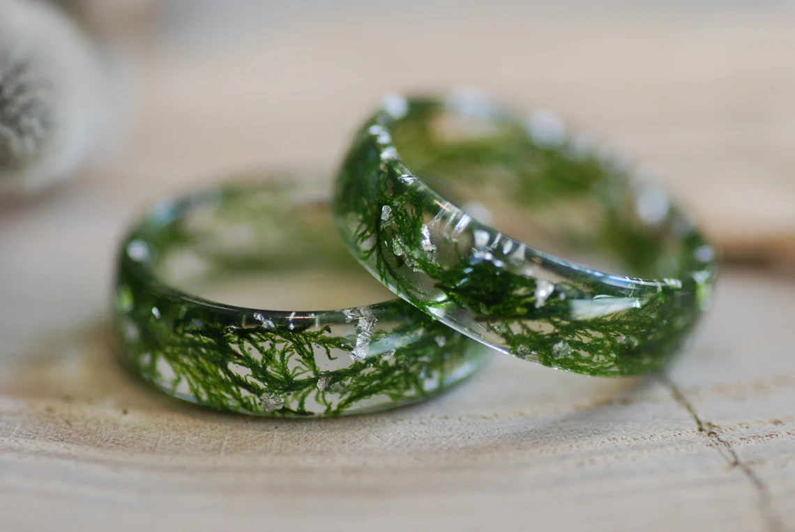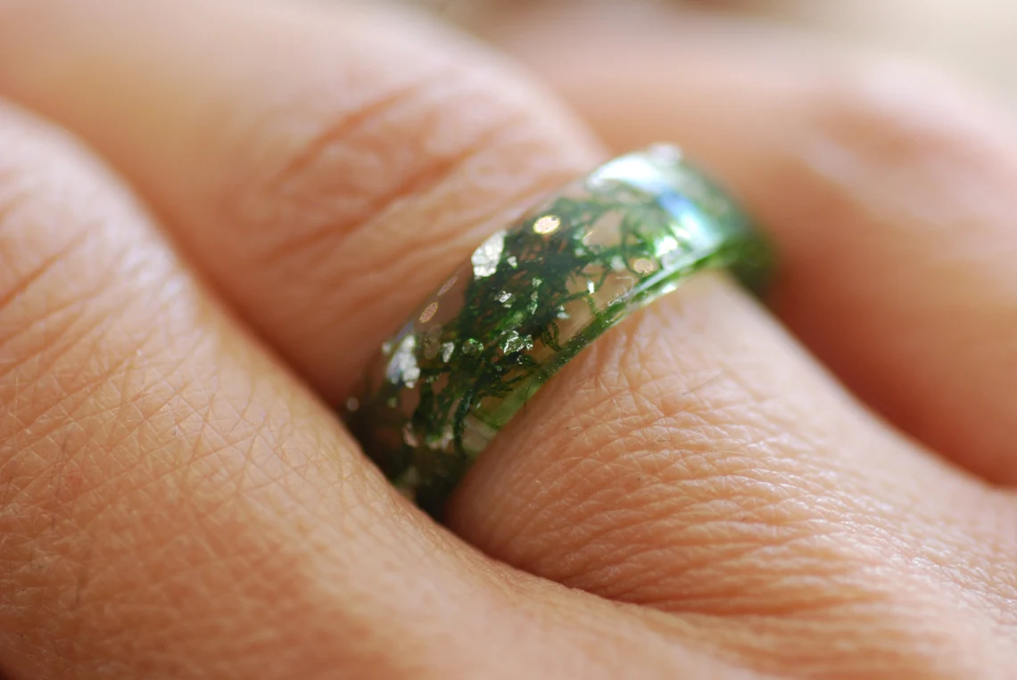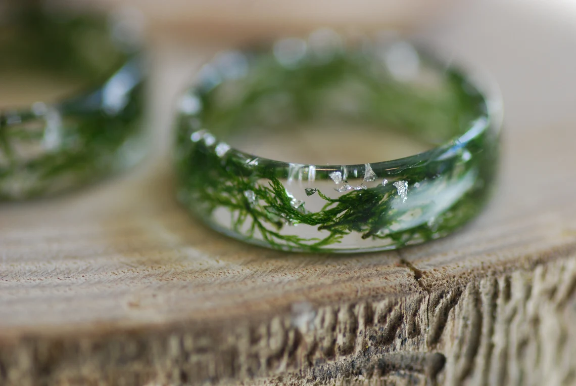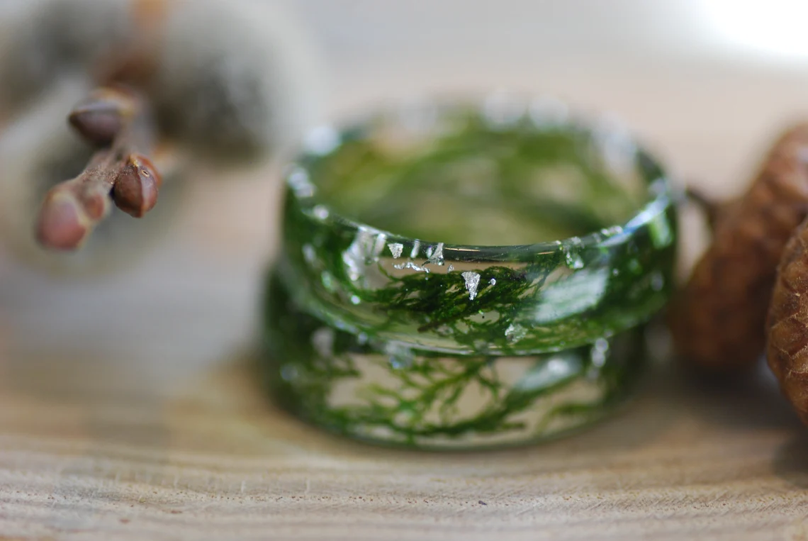 This thin and slightly flat band is made with preserved real moss leafs and a touch of sparkling 925 Sterling Silver Flakes all in clear resin.