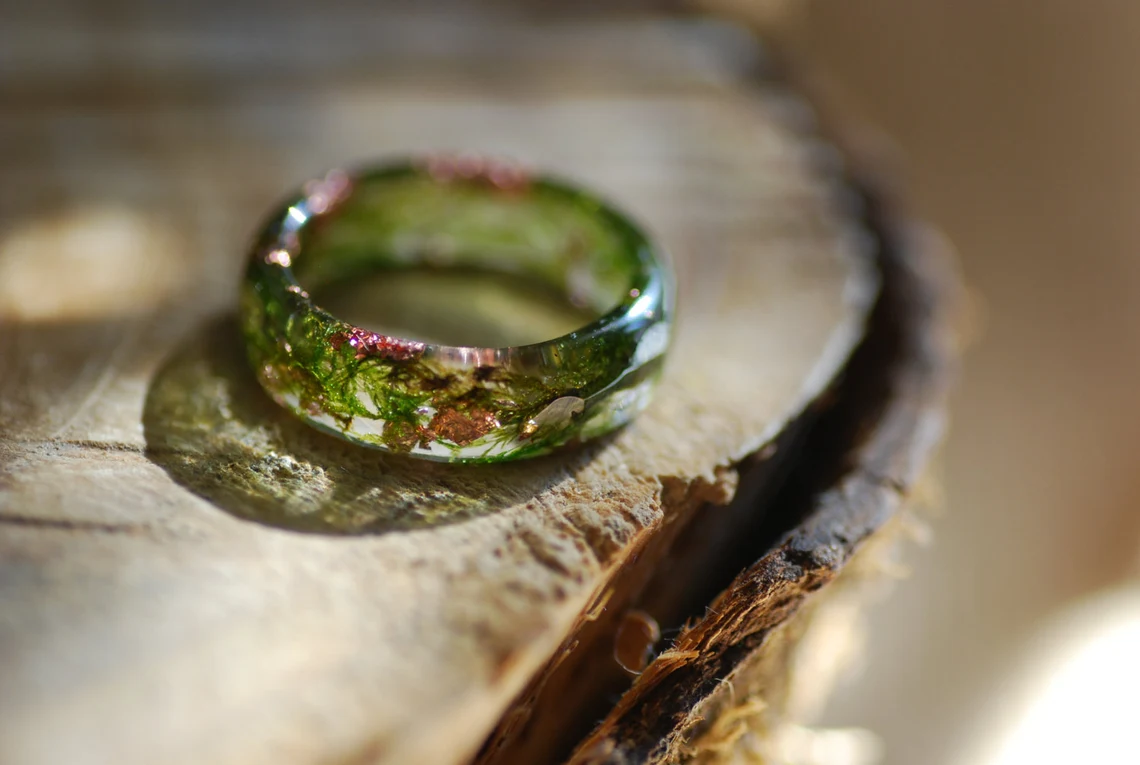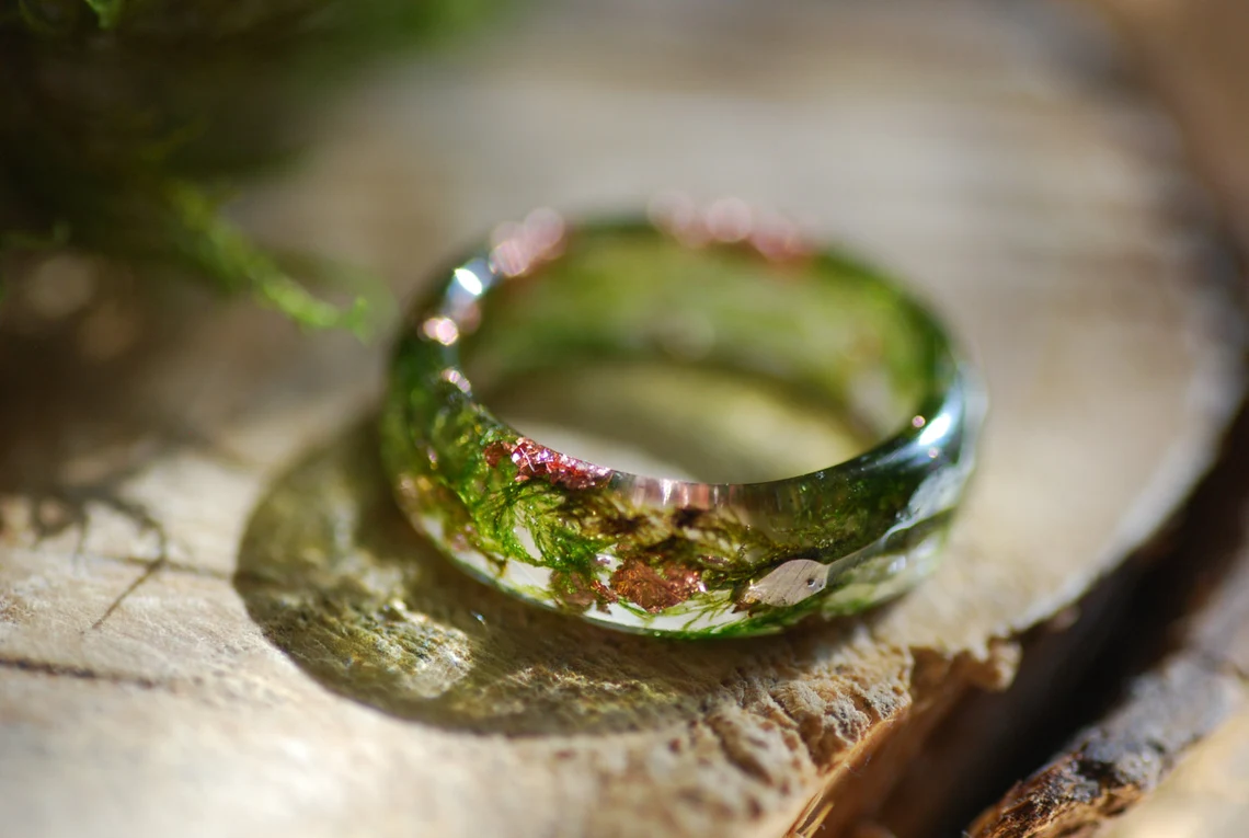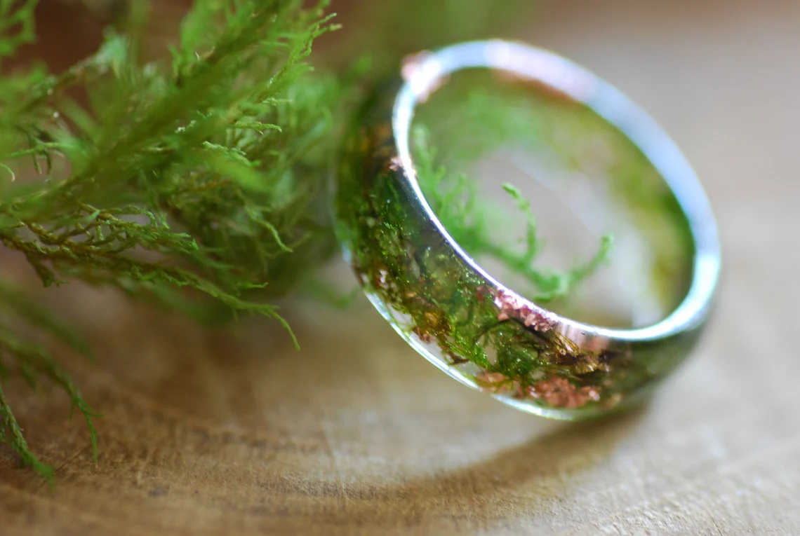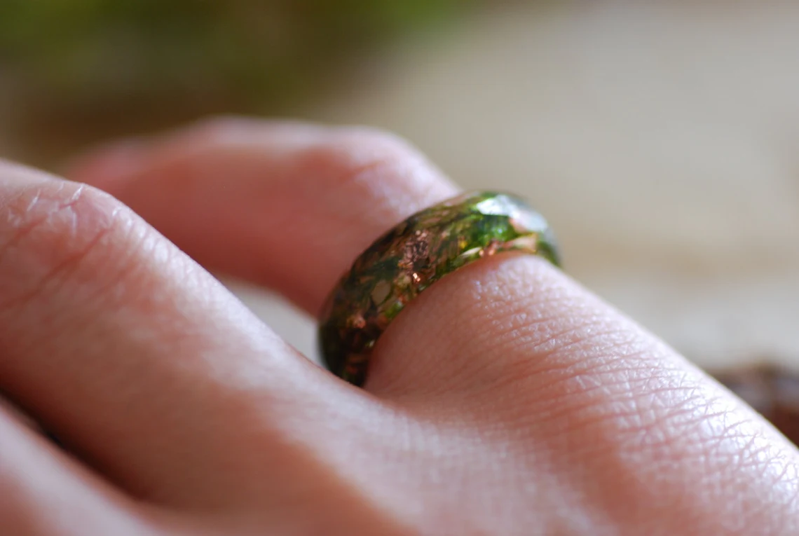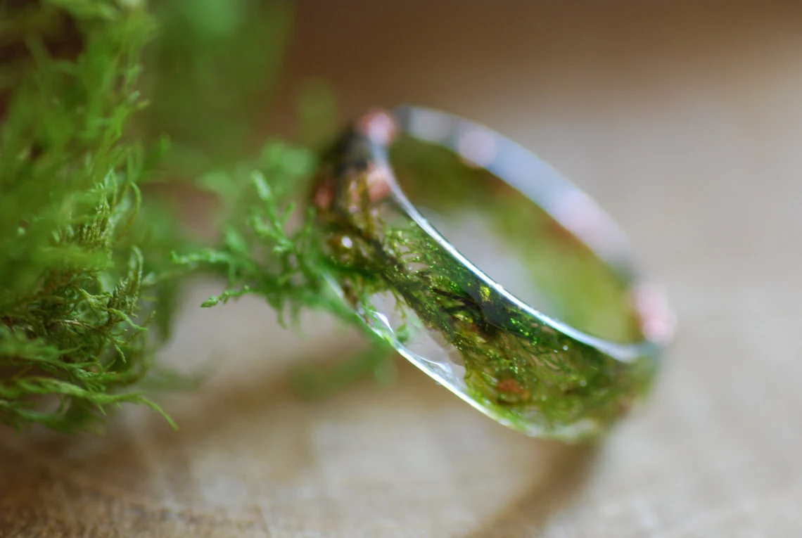 Thin band is made with preserved real green moss and rose copper flakes in a clear resin.