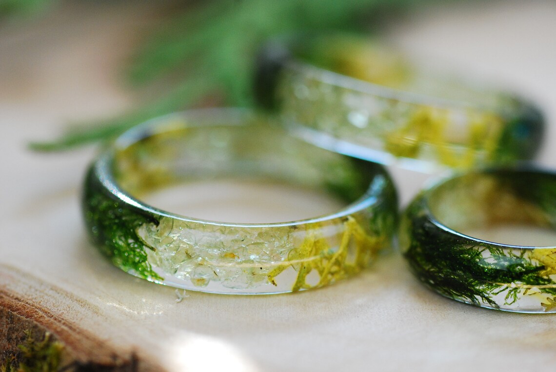 This natural forest ring is made with Peridot crystals, real green moss and greenish yellow lichen leaves, in clear resin.