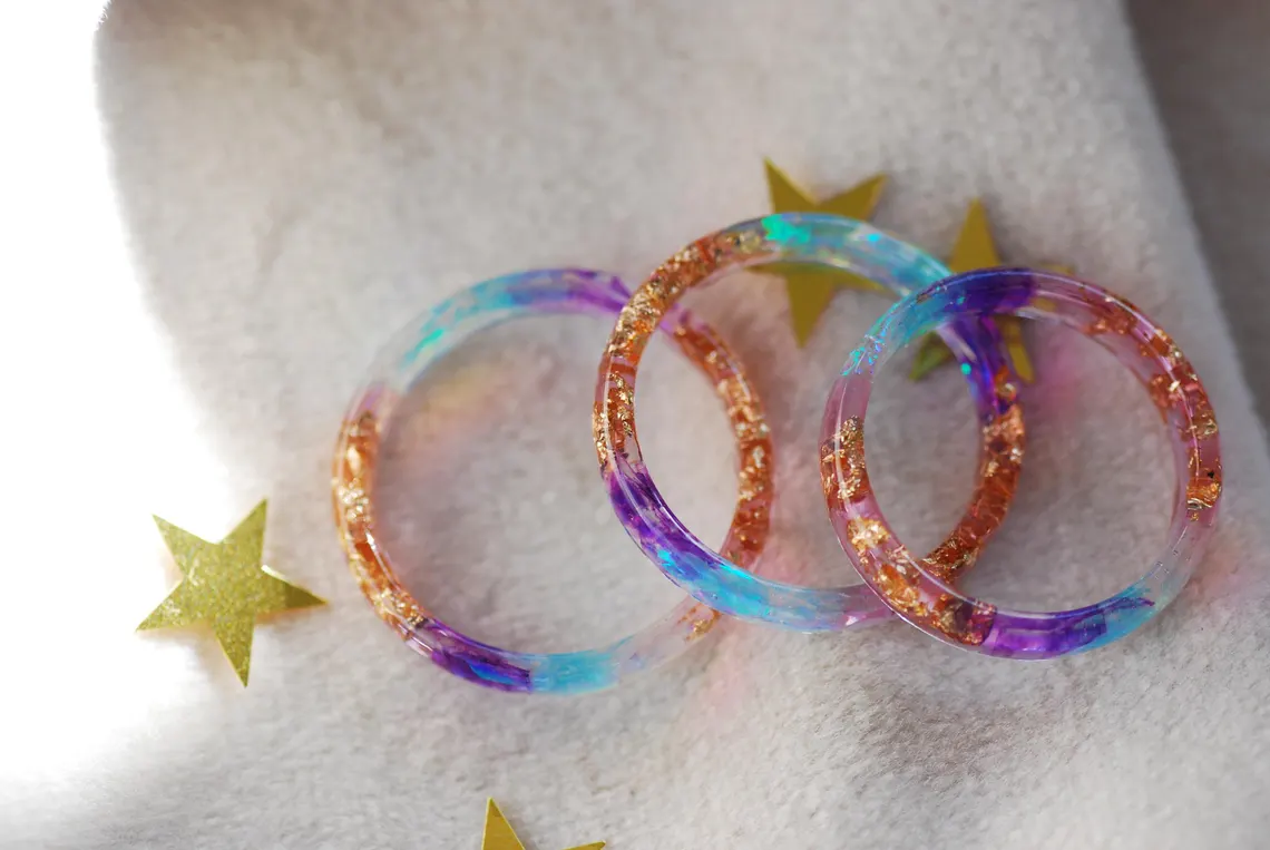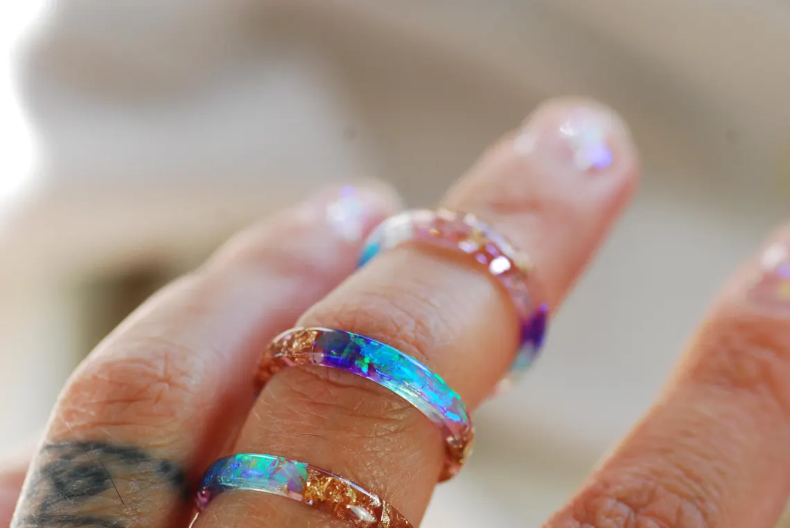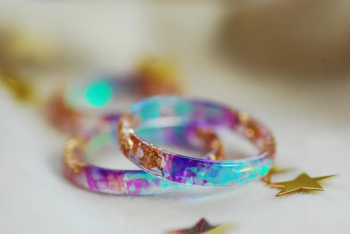 Each ring is unique, made with pink pigments and gold flakes suspended in the resin.