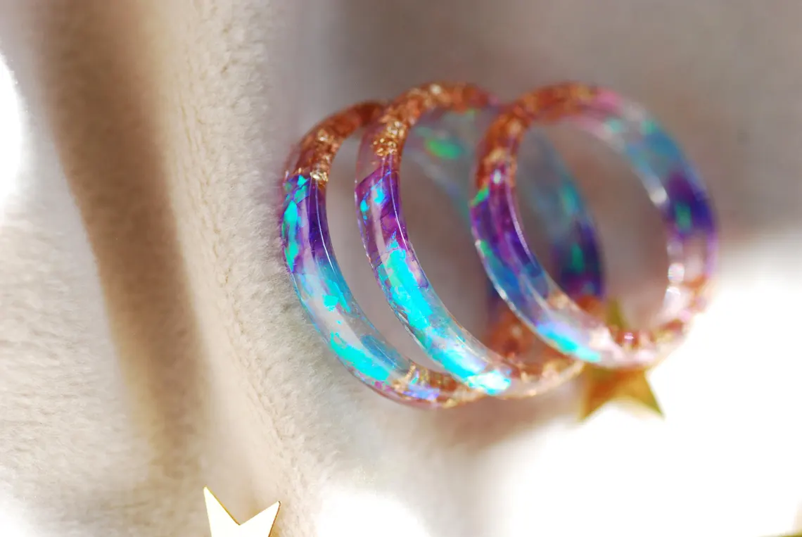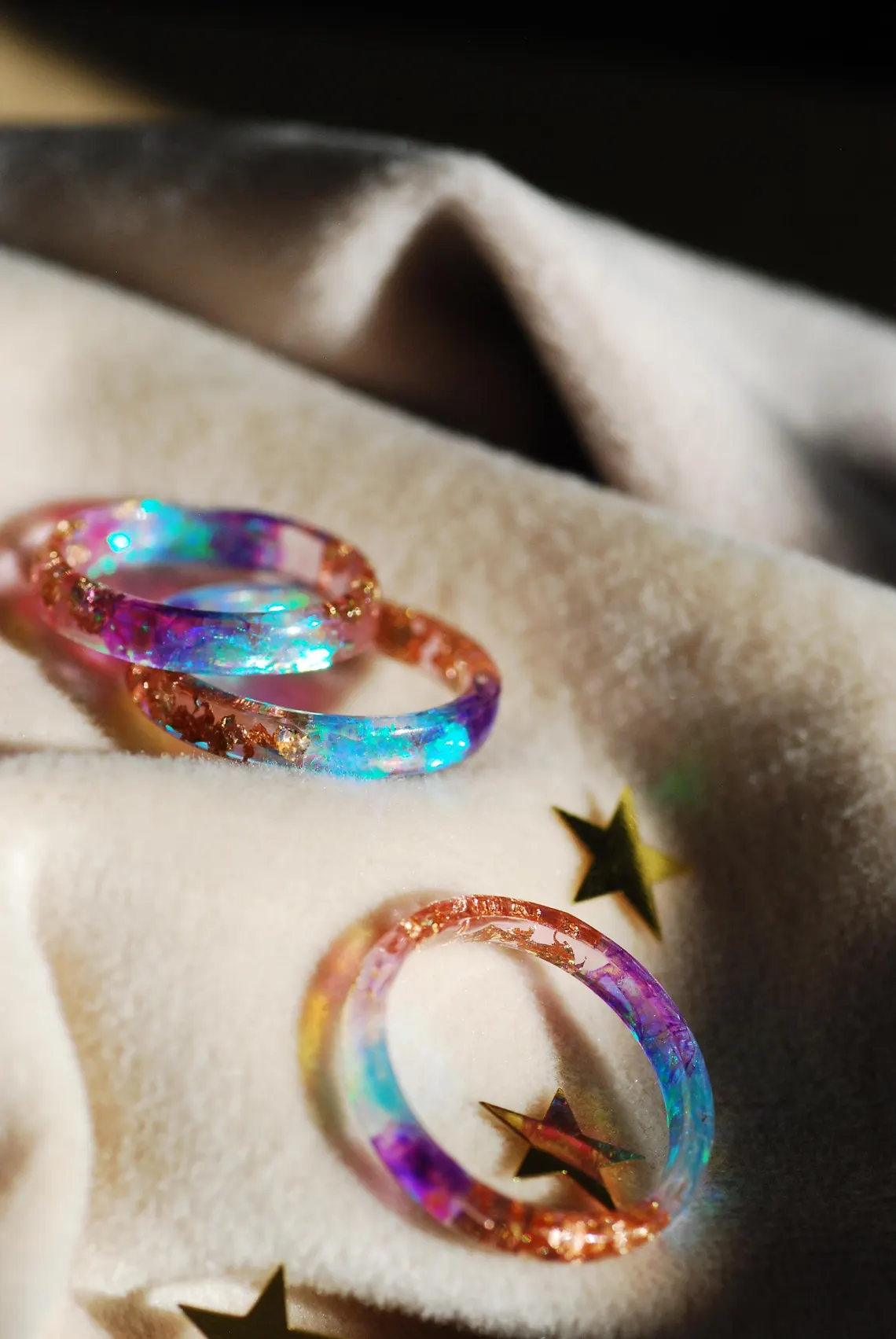 These mesmerizing rainbow rings are designed and inspired in a fantasy world and beauty of cosmos, tones of blue turquoise purple and copper harmoniously accompanying iridescent magic effect that reflects rainbow colors under the sunlight.