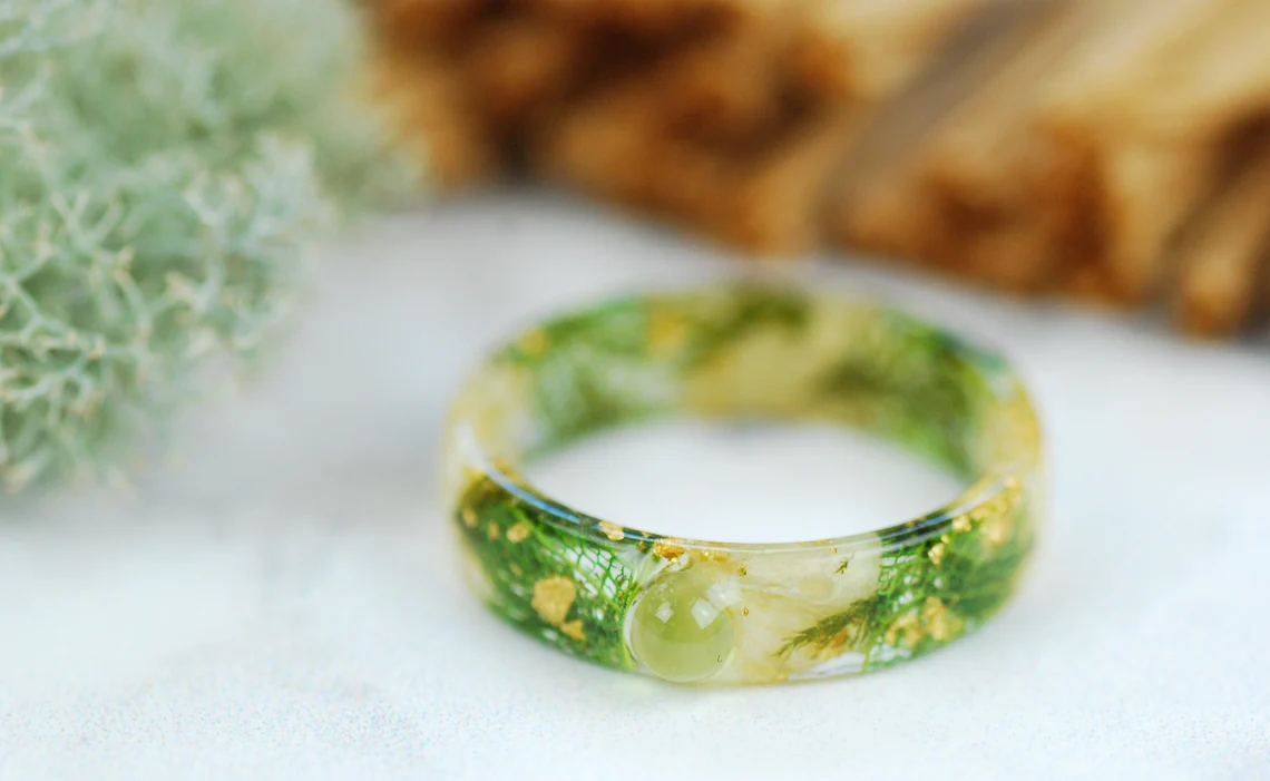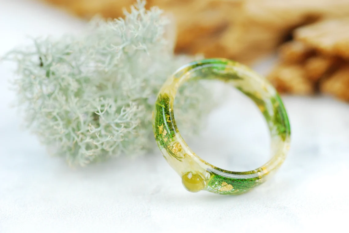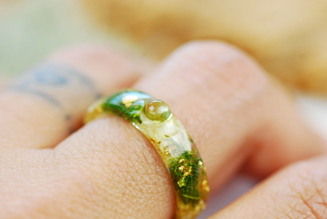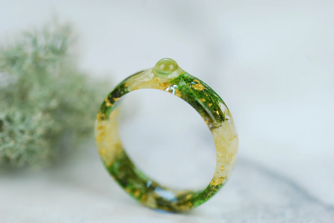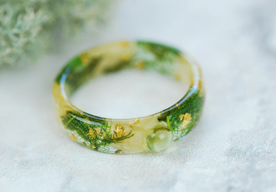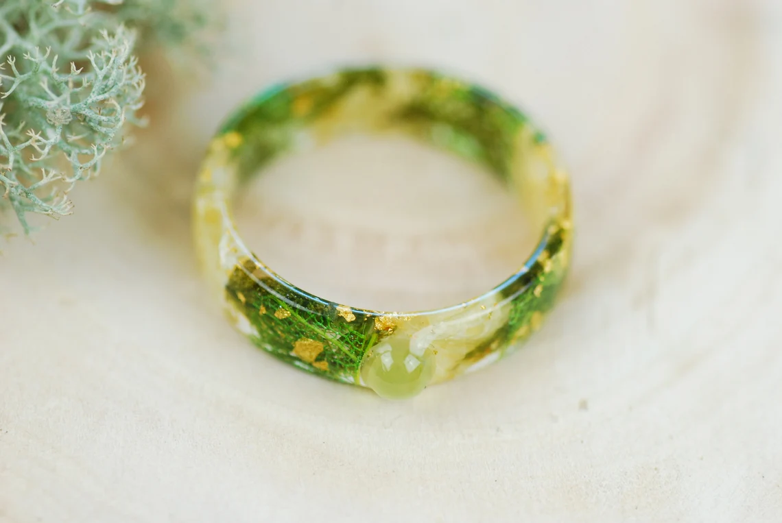 Ring is made with handpicked and preserved green moss, jasmine flowers, green skeleton leaves 24k Gold flakes in Eco Resin.