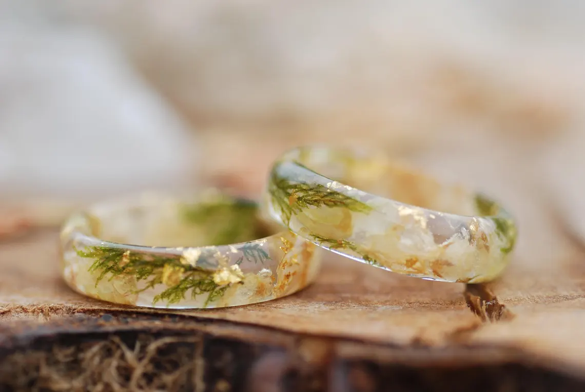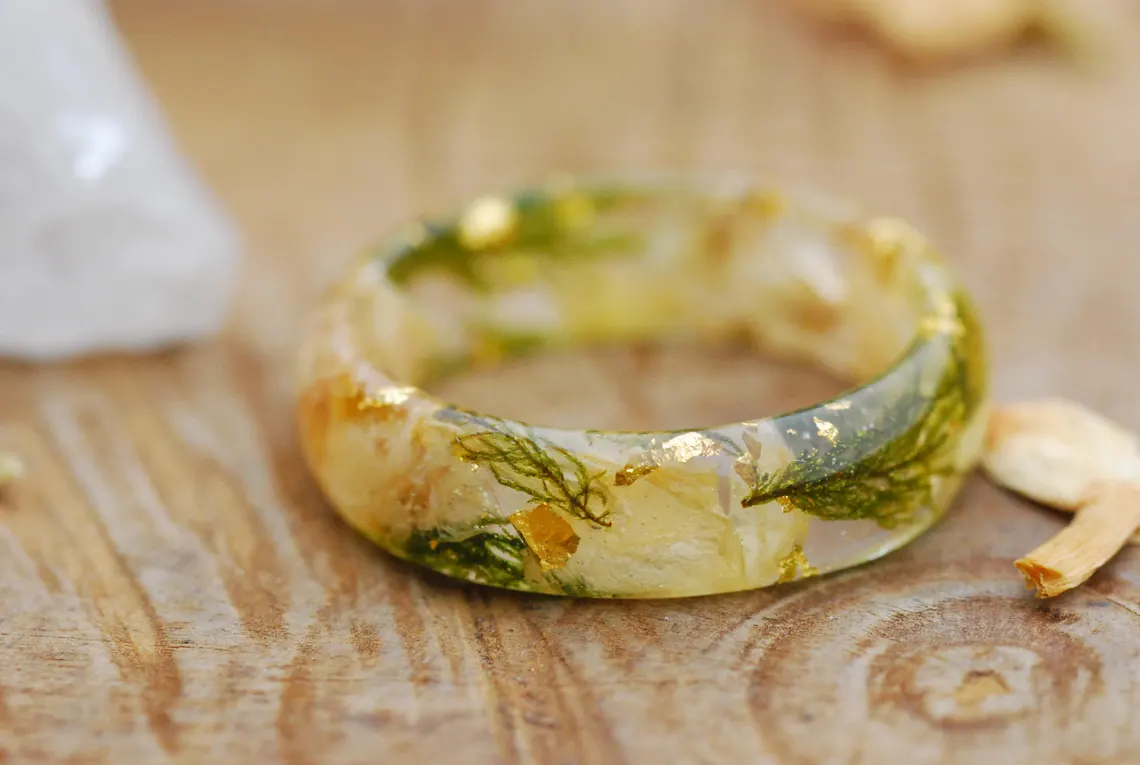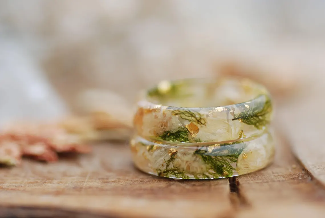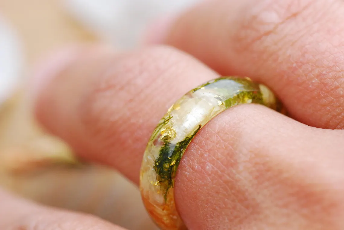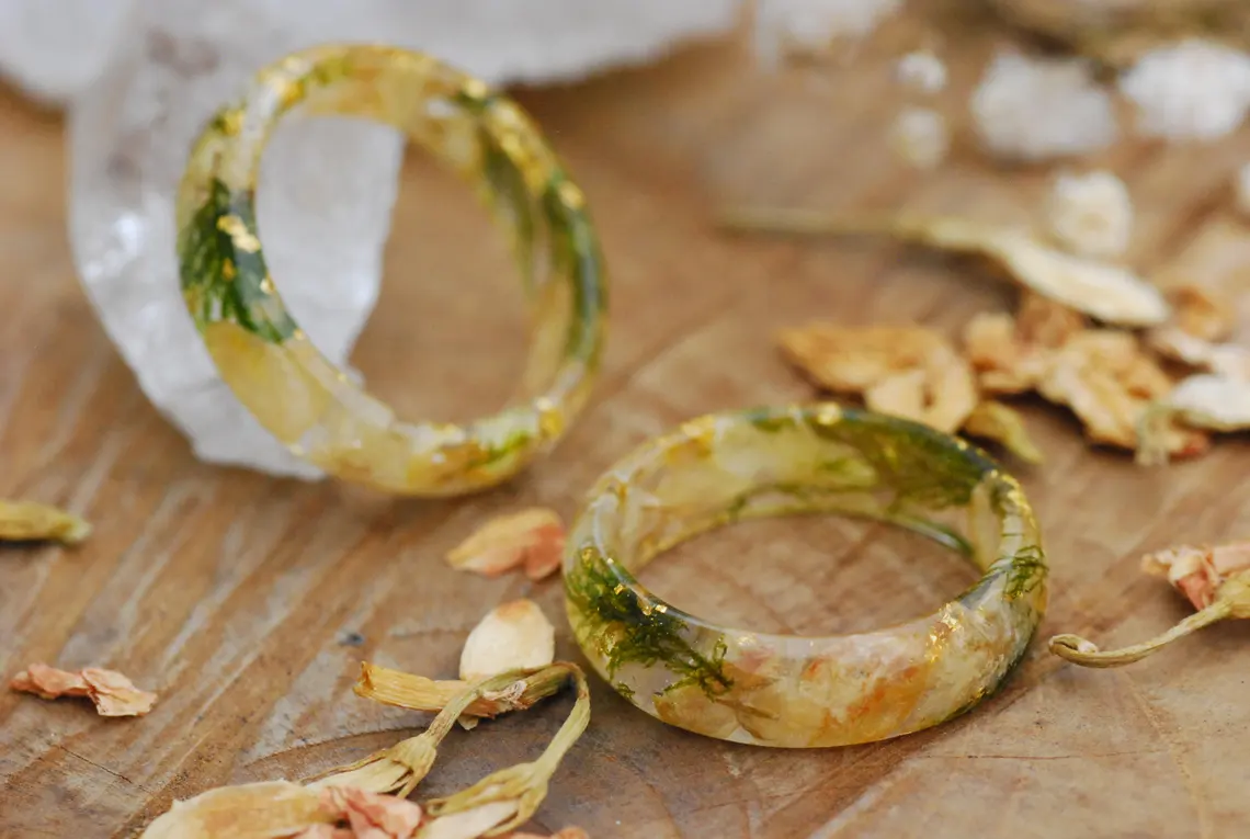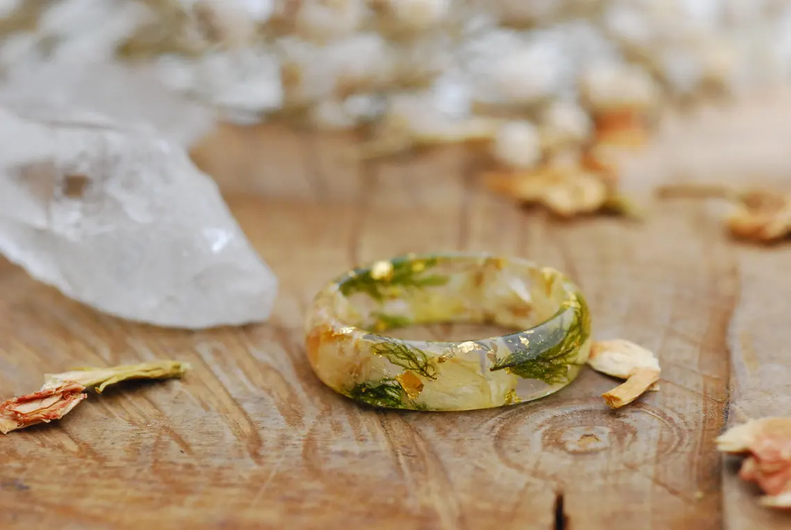 Perfect for weddings or as a charming accessory, this ring showcases preserved pressed flowers of Jasmine and Baby’s Breath petals, along with real green moss and 24K gold flakes, all encased in clear Eco resin.