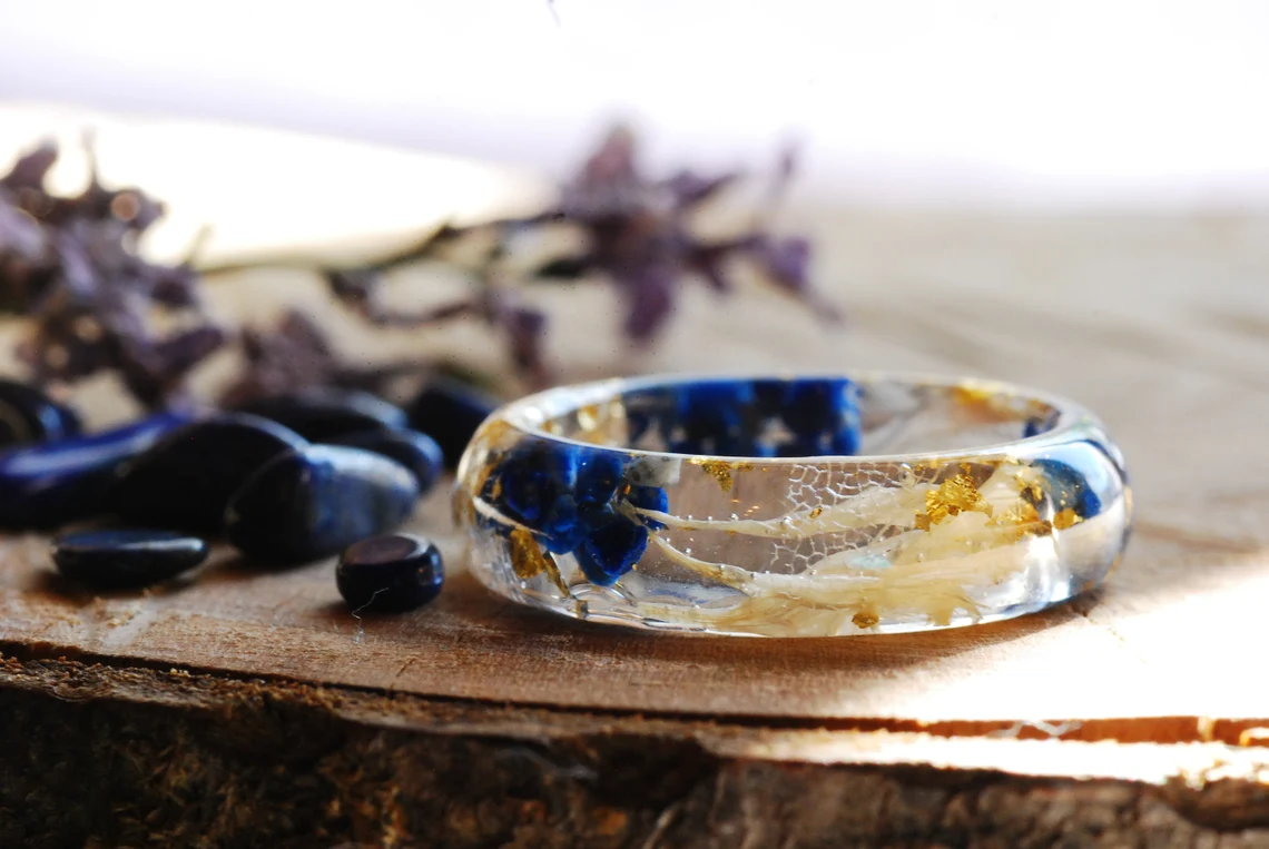 This vibrant and unusual resin lapis lazuli ring is made with lapis stones, delicate white cornflowers, white skeleton leaves and 24k gold flakes.