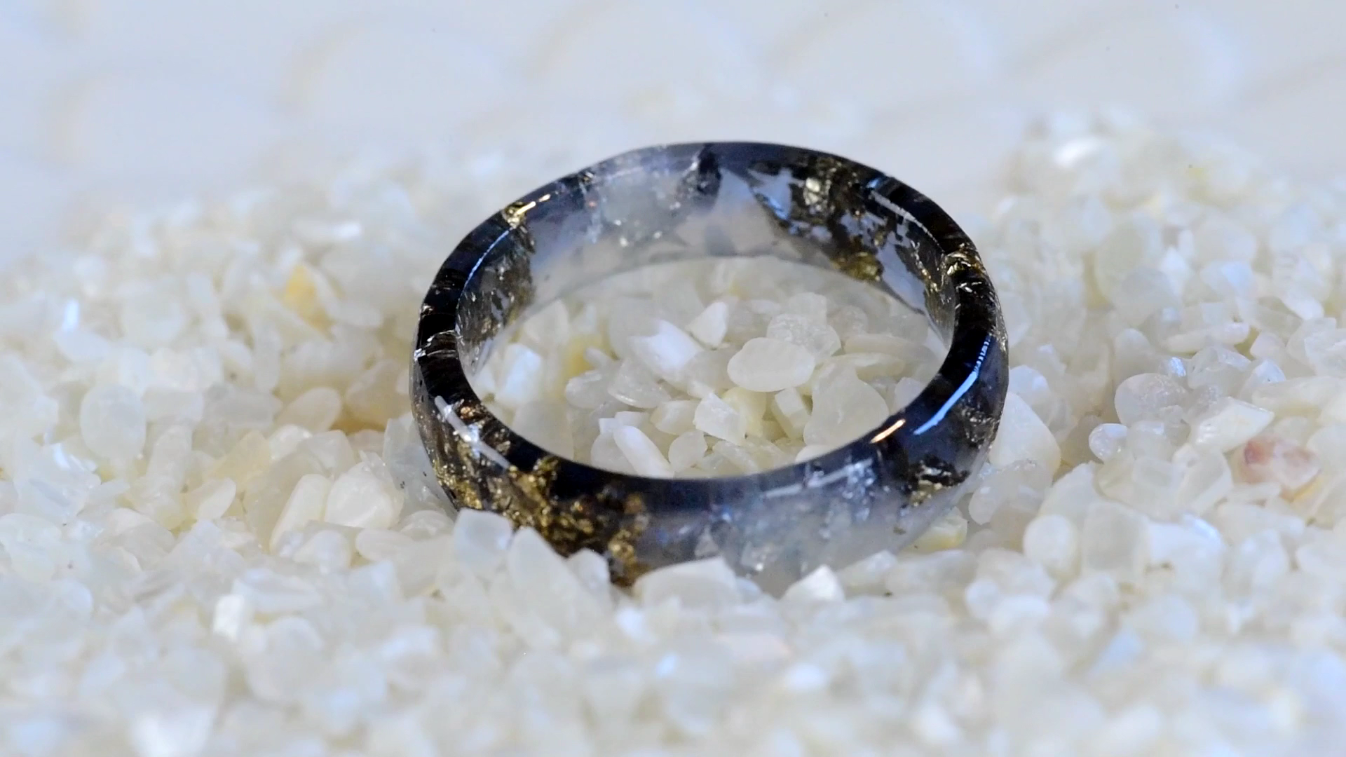 Faceted geometric style, this ring is made with Black semitransparent and white shimmering resin. Each ring is unique, transparent and shinny, black weaves of marble contain 24k gold and silvery white contain sterling silver flakes.