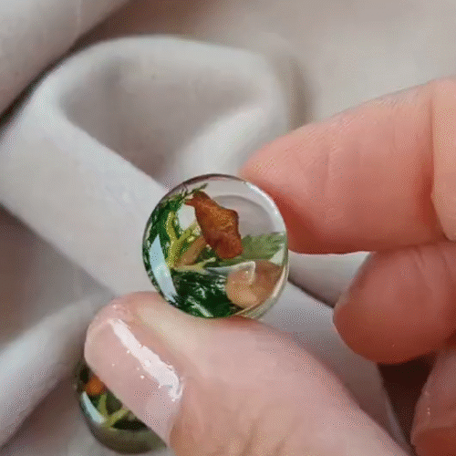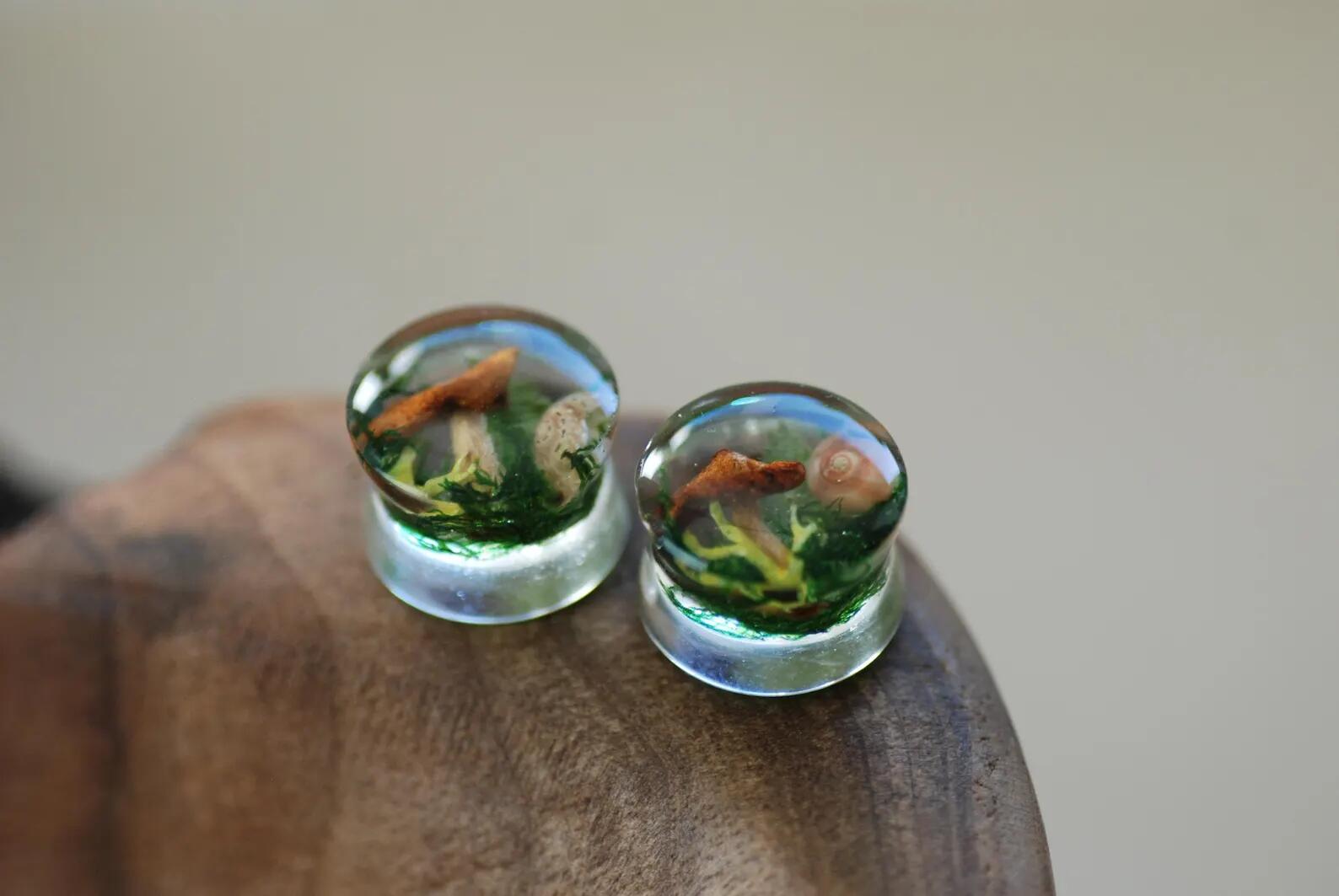 Gauges are made with real dried mushrooms moss and lichens, all composing little magic forest landscape