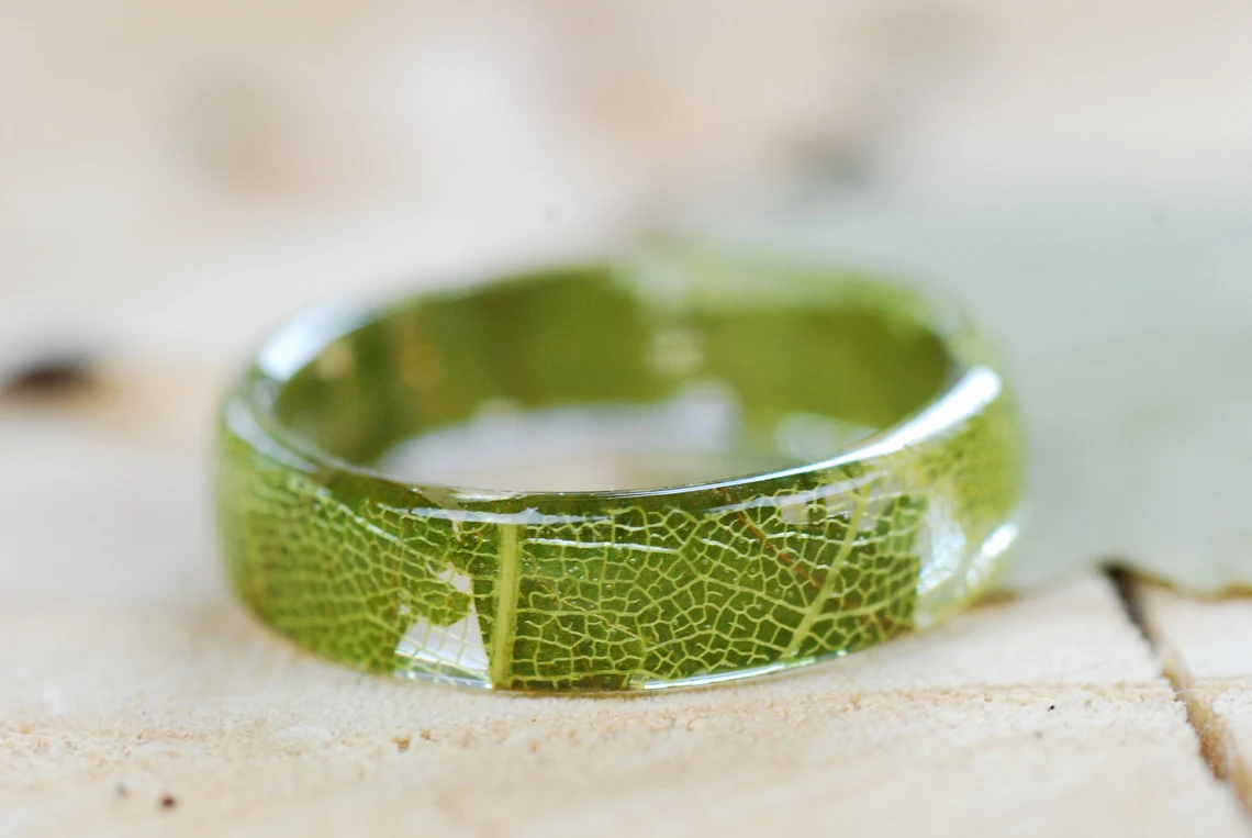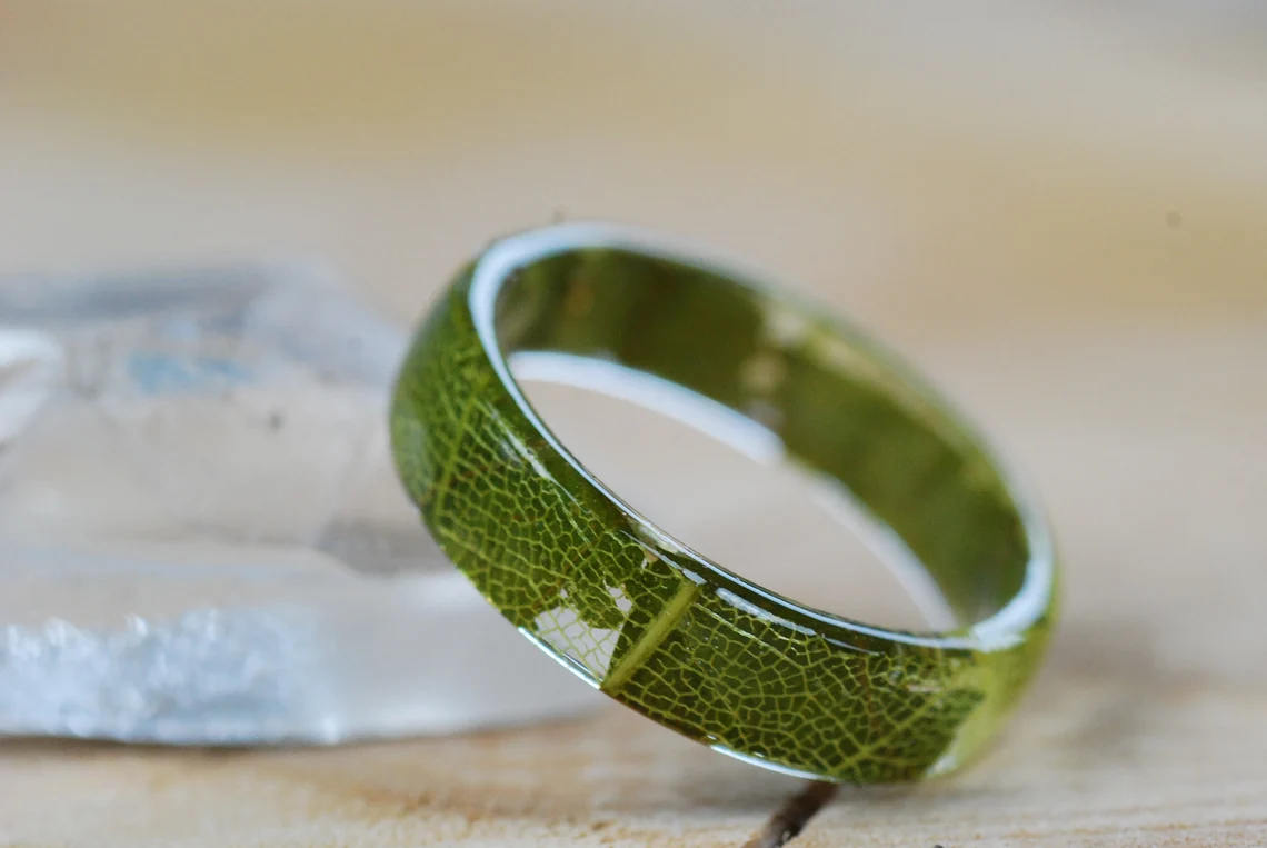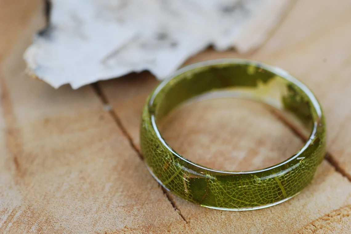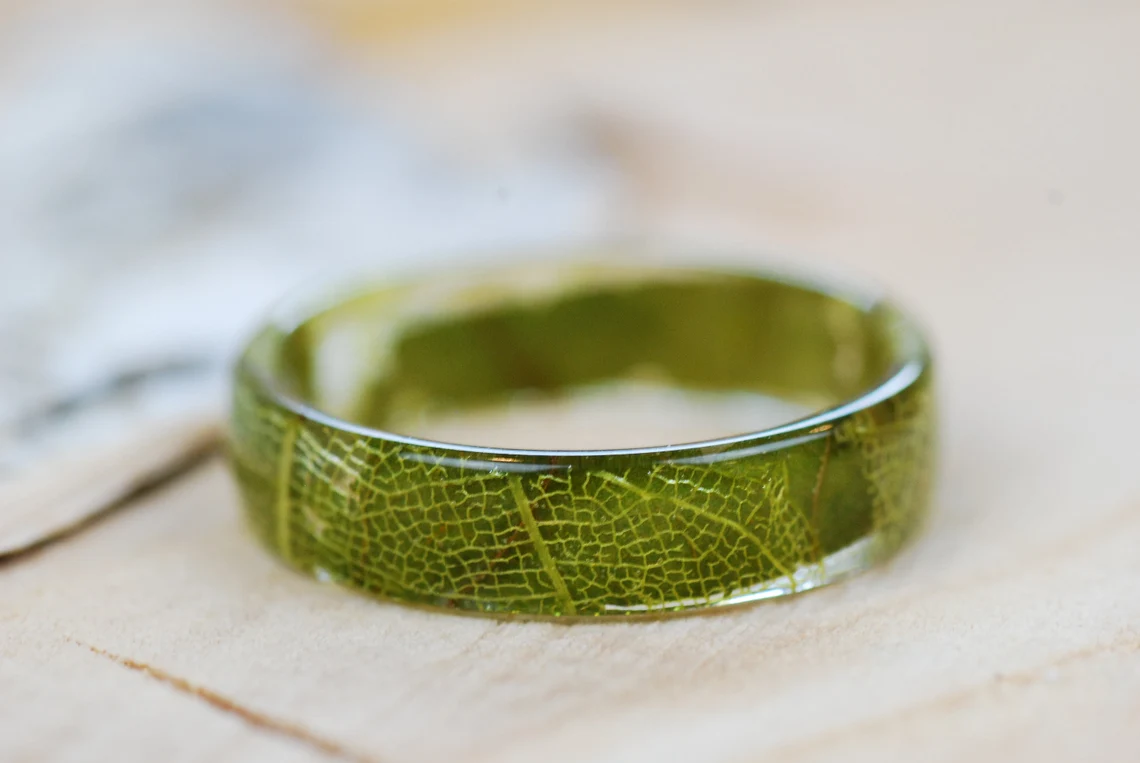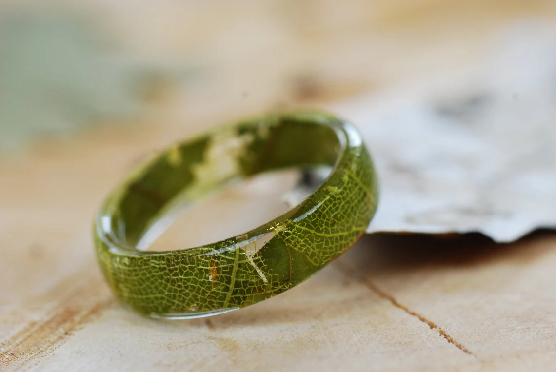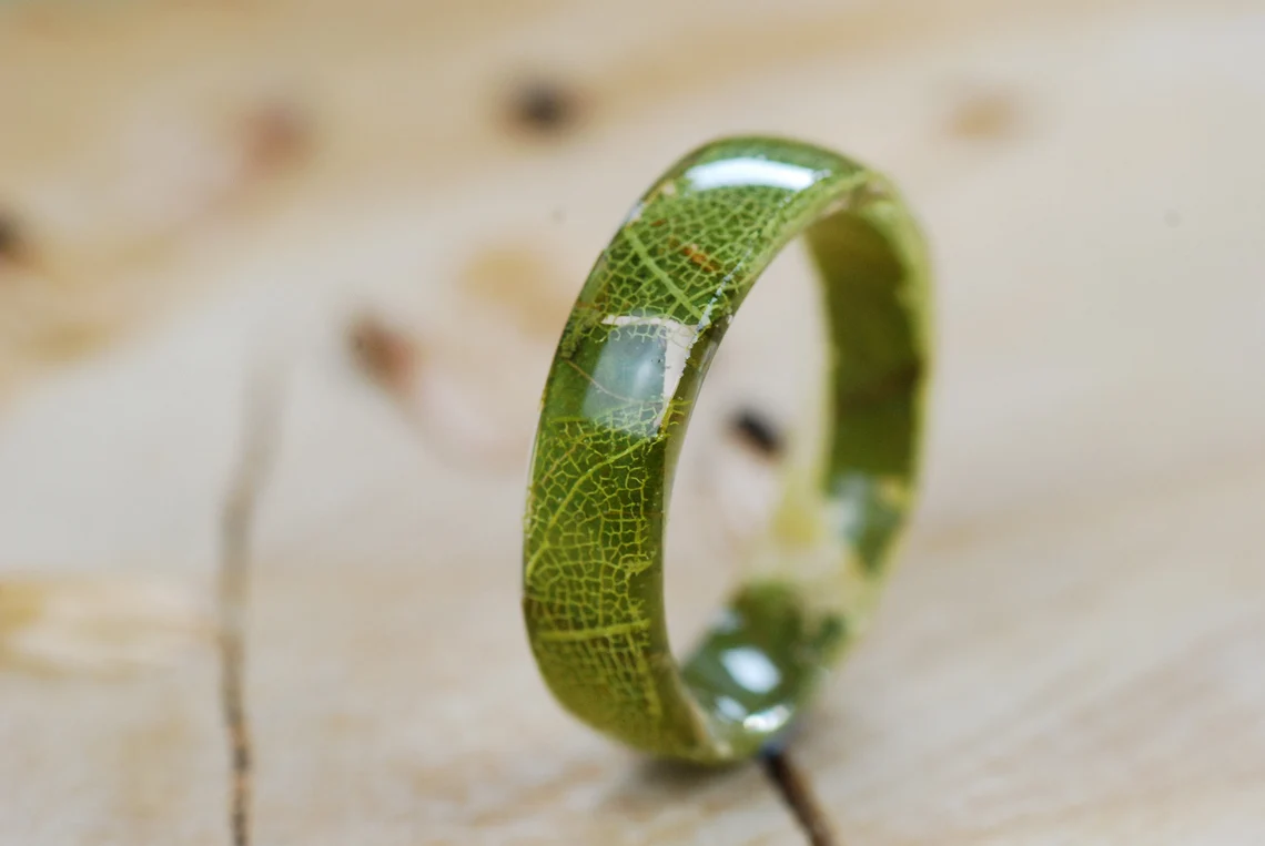 Wonderful nature inspired green oak ring made with dried oak leaf and yellow skeleton leafs set in clear resin.