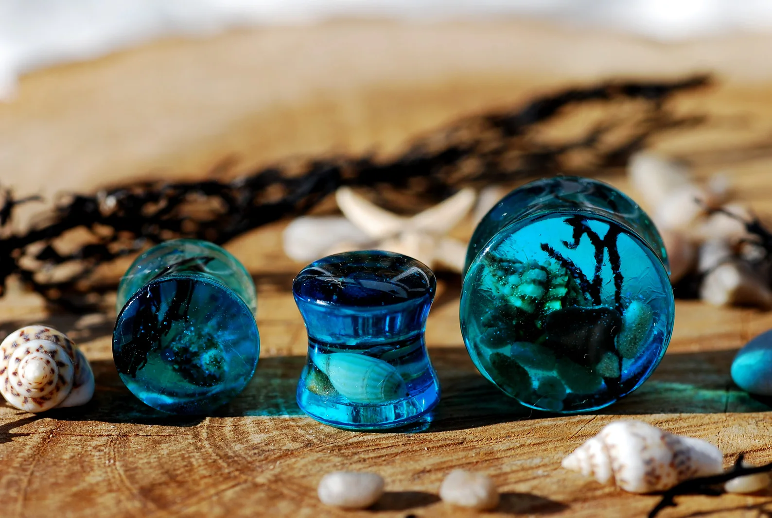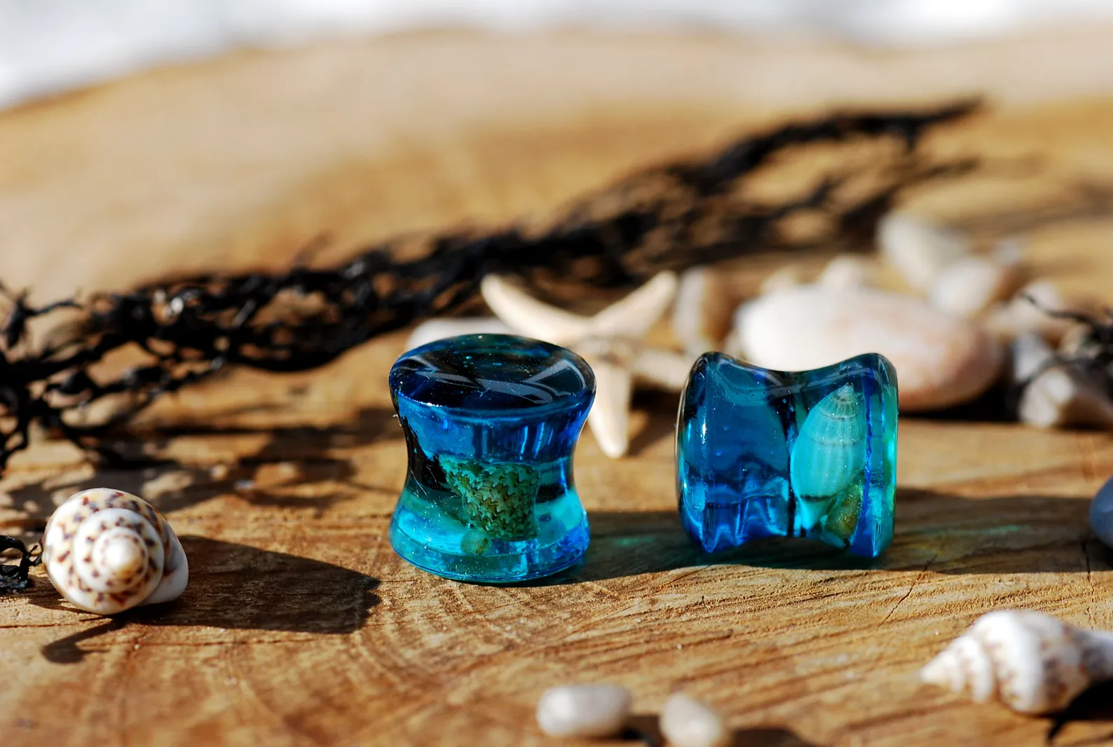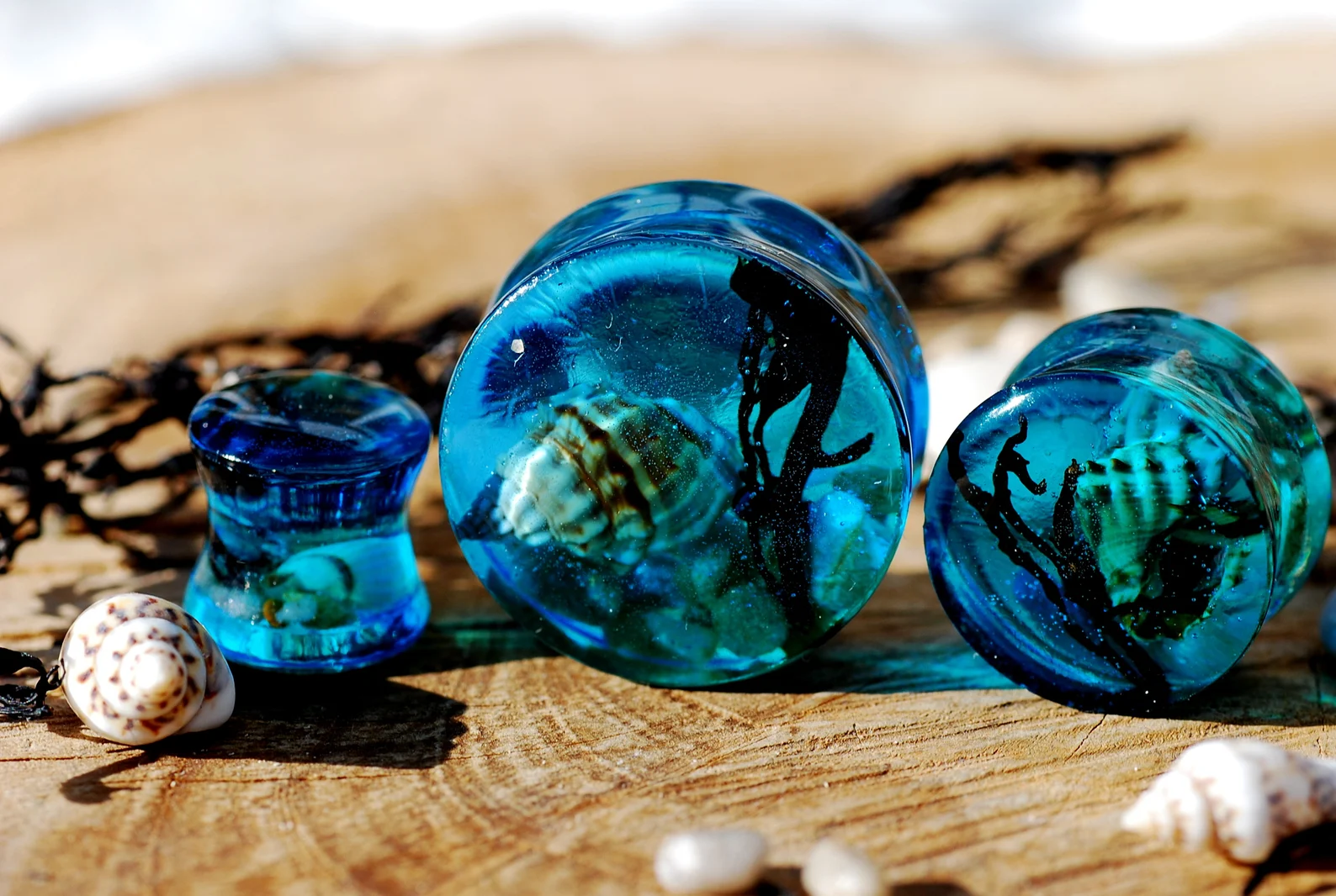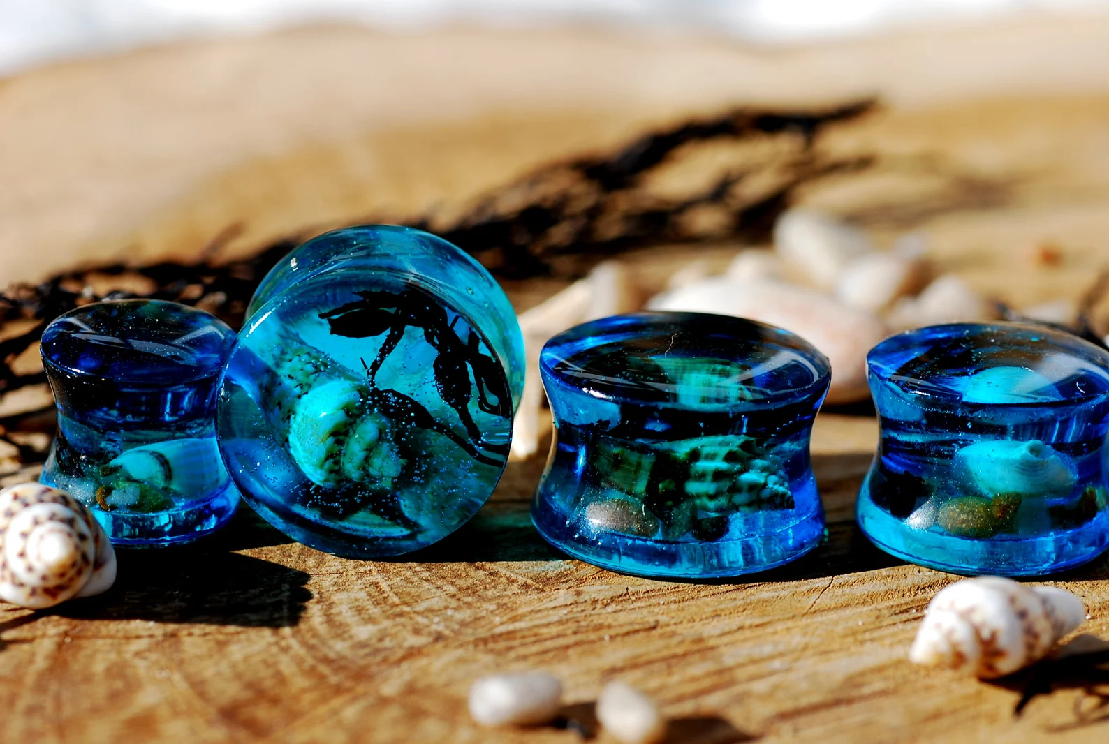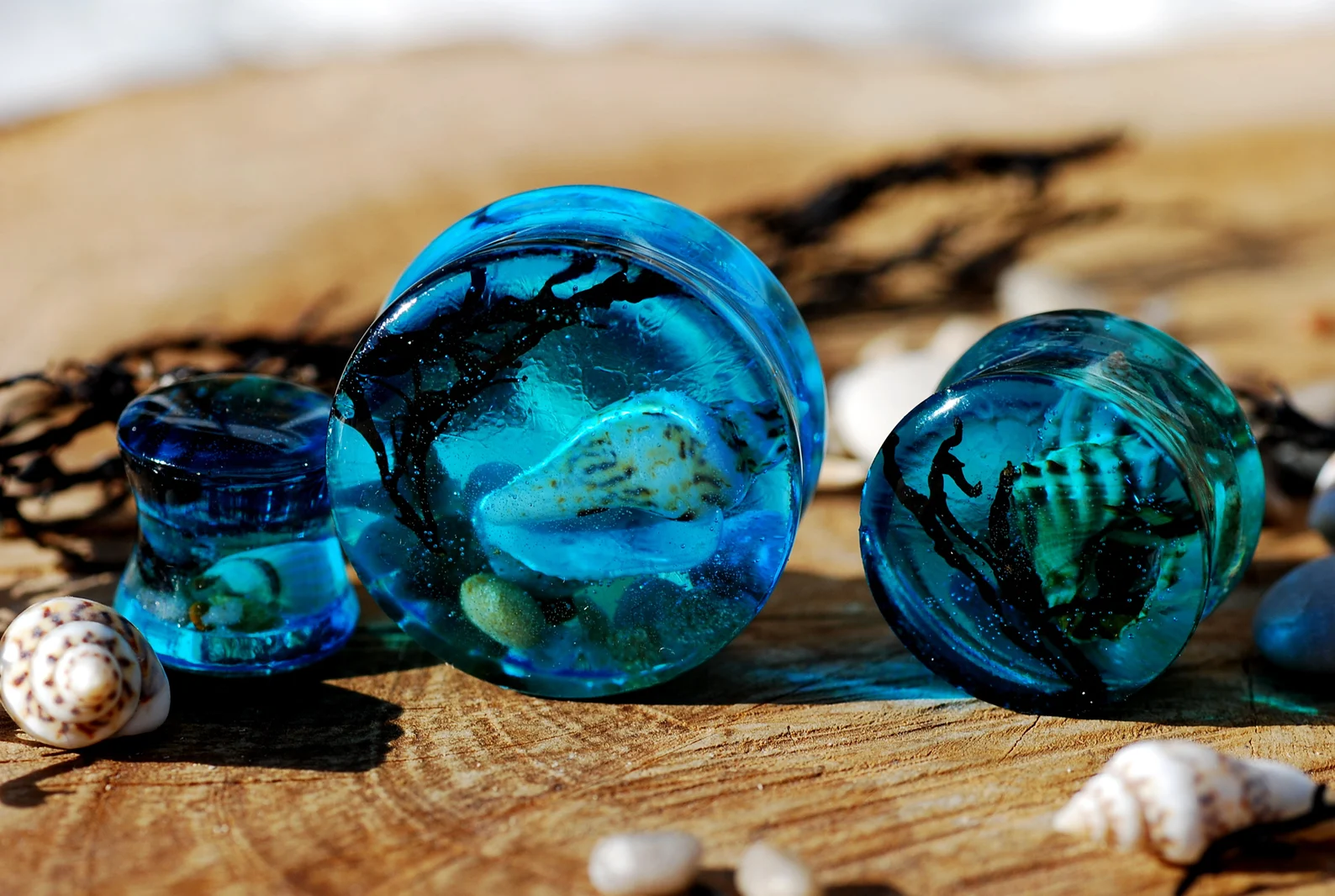 A small piece of blue sea with its life forms, seashells, beach sand and black seaweed encapsulated in high gloss resin piercing takes its force wherever You go.