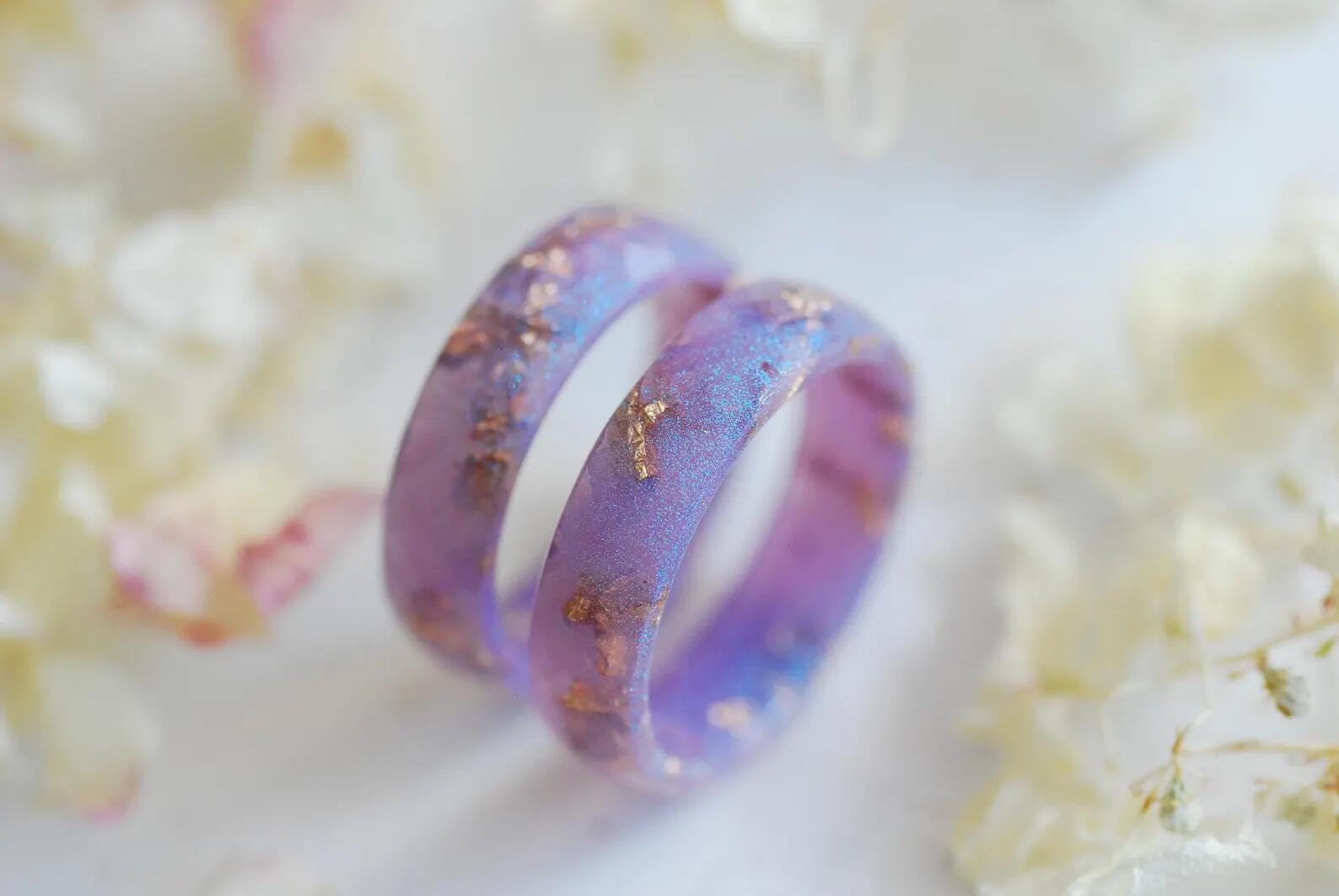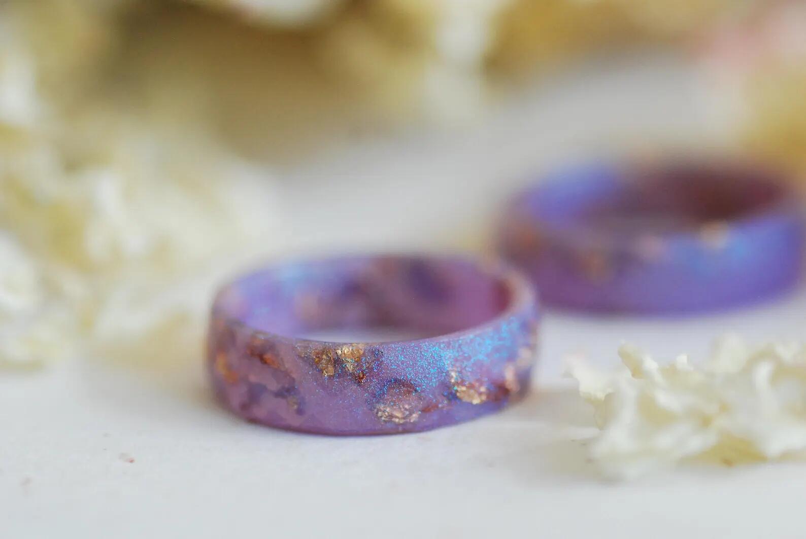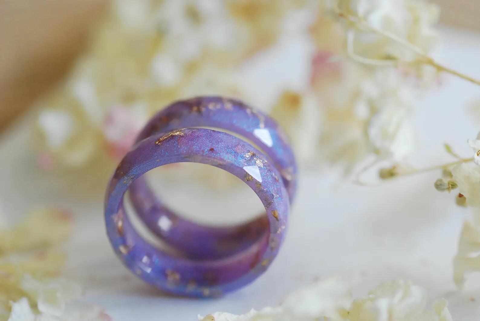 These beautiful rings are designed and inspired by fantasy and cosmic nature, they are handmade with purple resin and aurora iridescent glitter that changes color in the sunlight. Gold flakes are suspended in the resin, giving each ring its own brilliant and glossy appearance.
