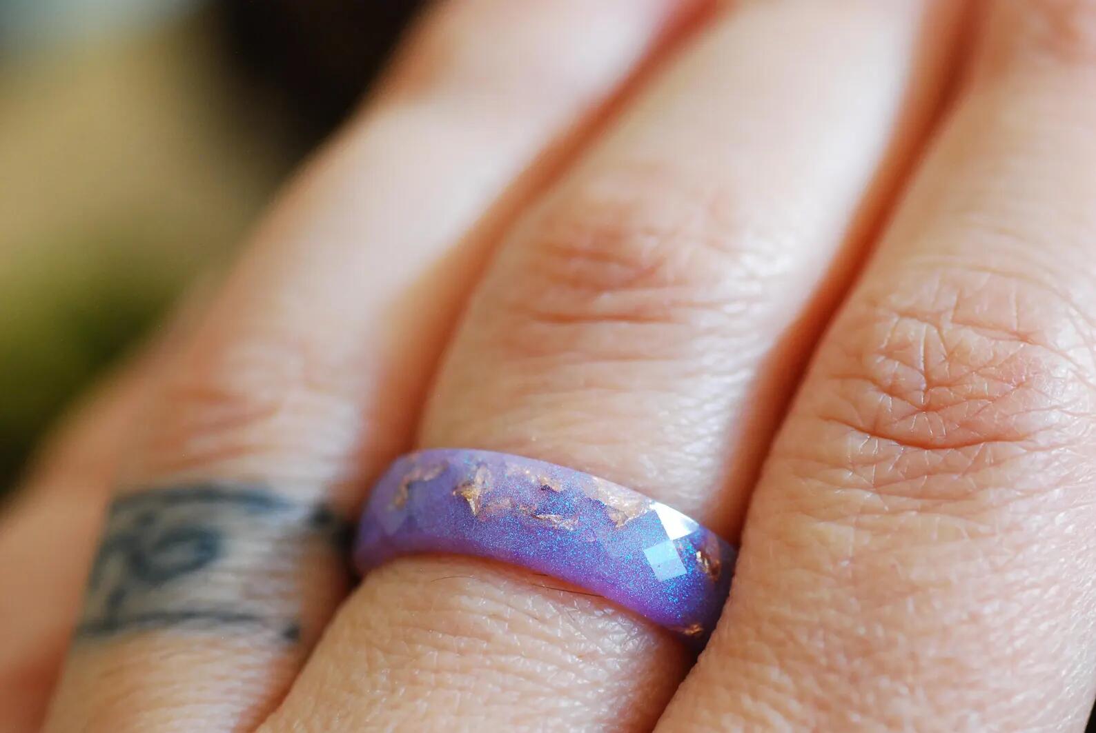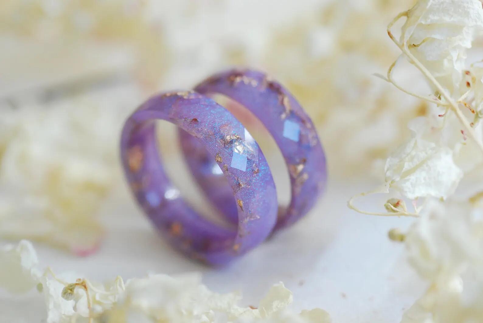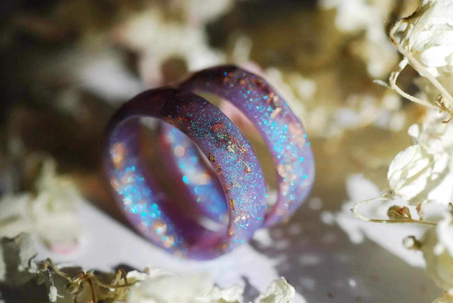 These beautiful rings are designed and inspired by fantasy and cosmic nature, they are handmade with purple resin and aurora iridescent glitter that changes color in the sunlight. Gold flakes are suspended in the resin, giving each ring its own brilliant and glossy appearance.