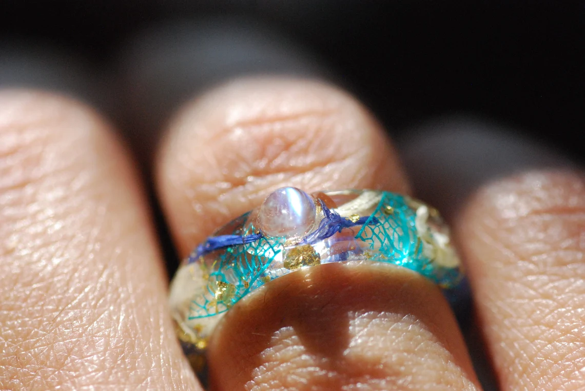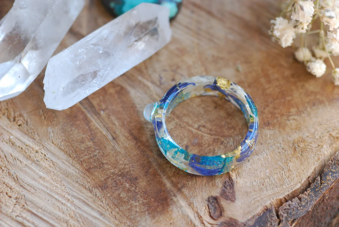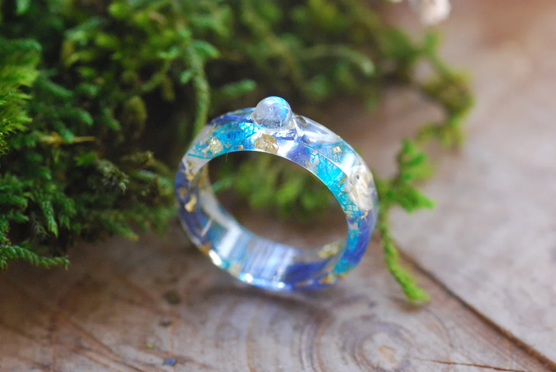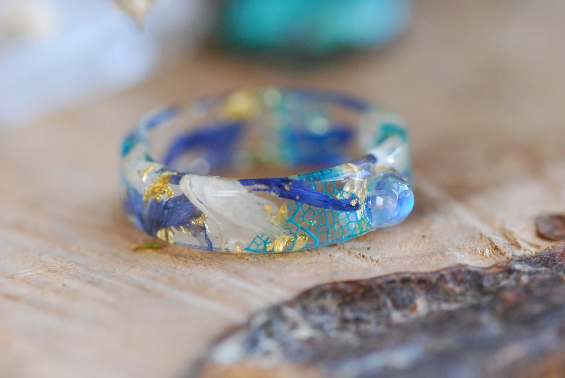 This enchanting band is made with preserved blue and white cornflower petals, a rounded rainbow moonstone gemstone, blue skeleton leaves and 24K Gold flakes in Eco based Resin.