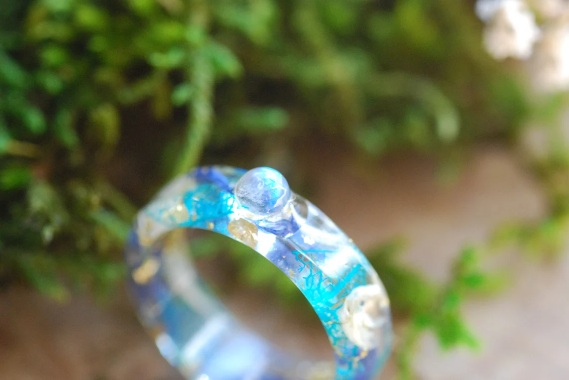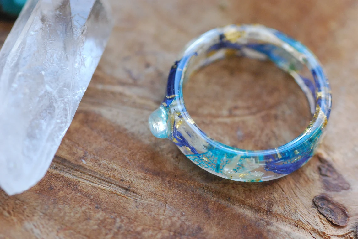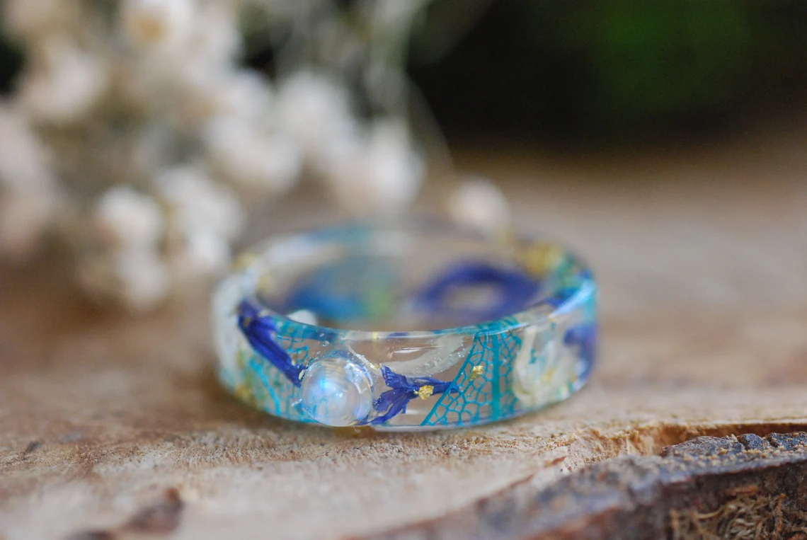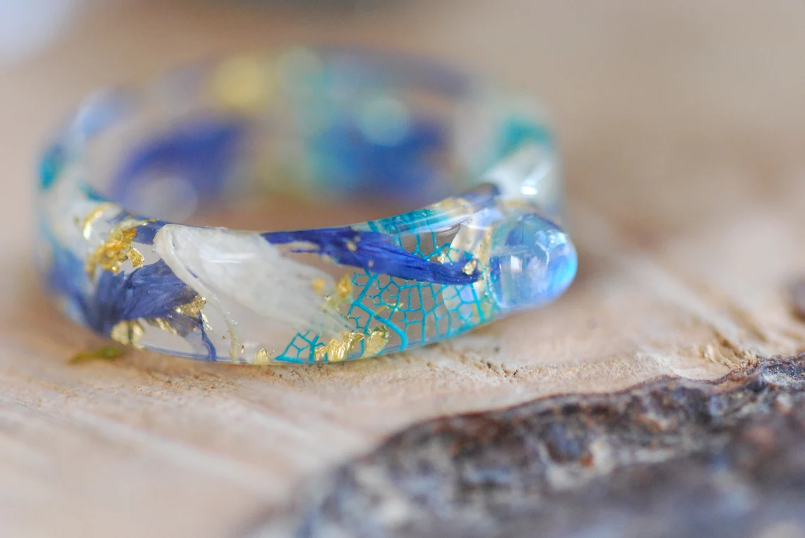 This enchanting band is made with preserved blue and white cornflower petals, a rounded rainbow moonstone gemstone, blue skeleton leaves and 24K Gold flakes in Eco based Resin.