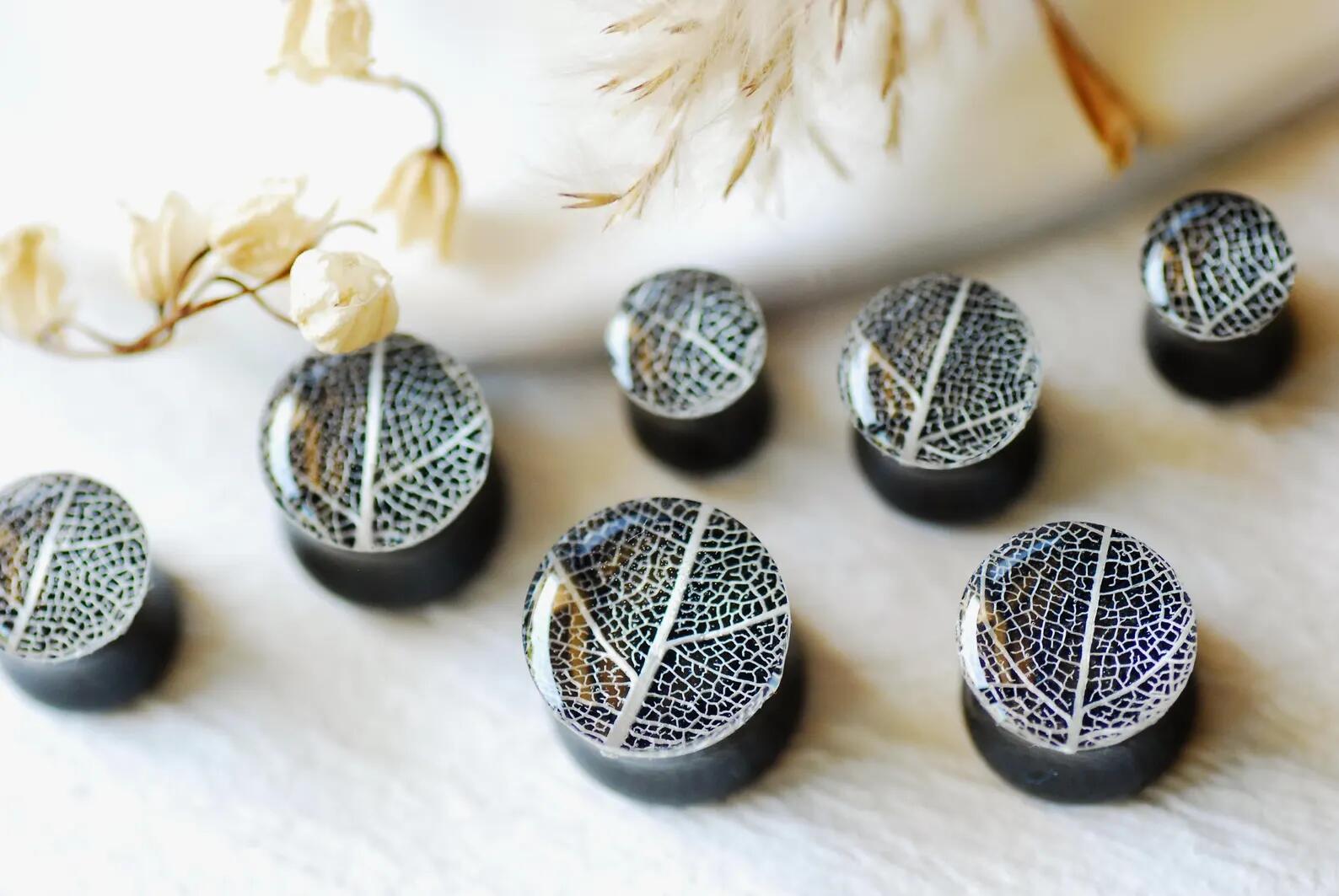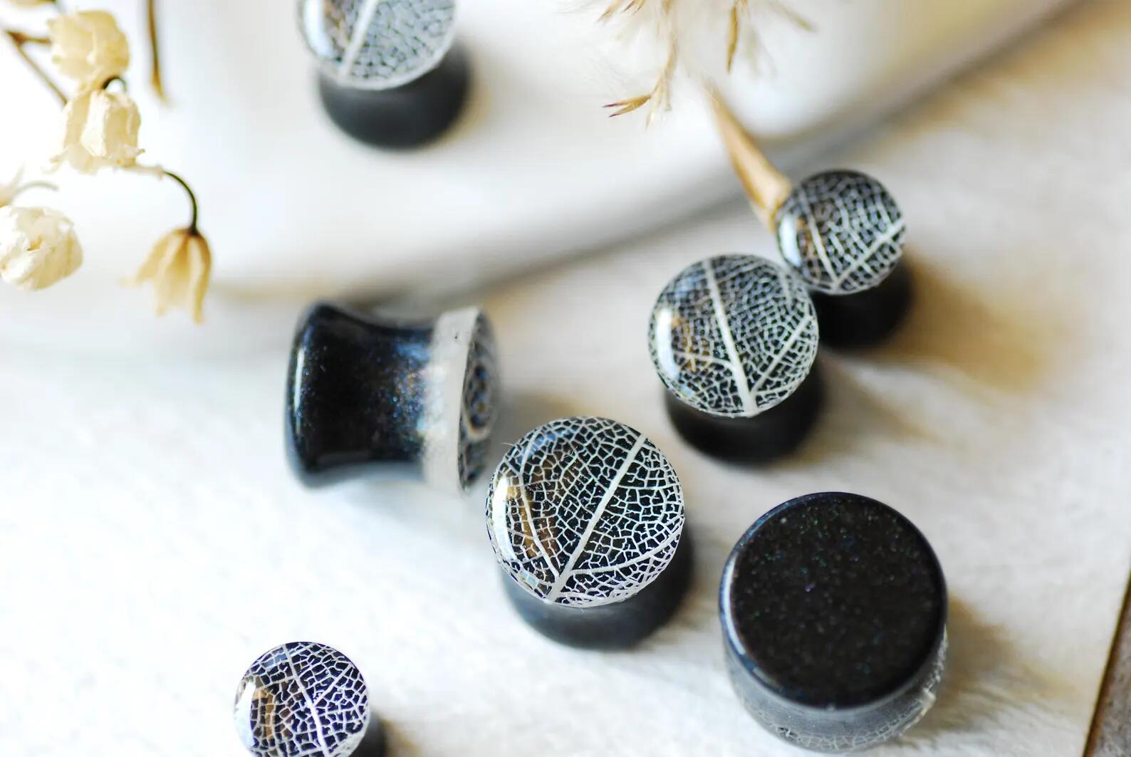 These double-flared earplugs, which are composed of black resin with pigments on the background, have a real white skeleton leaf set inside. The outcome is a beautiful black leaf effect.