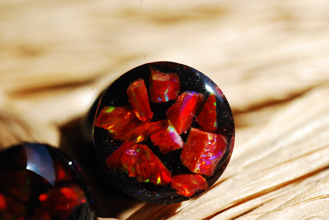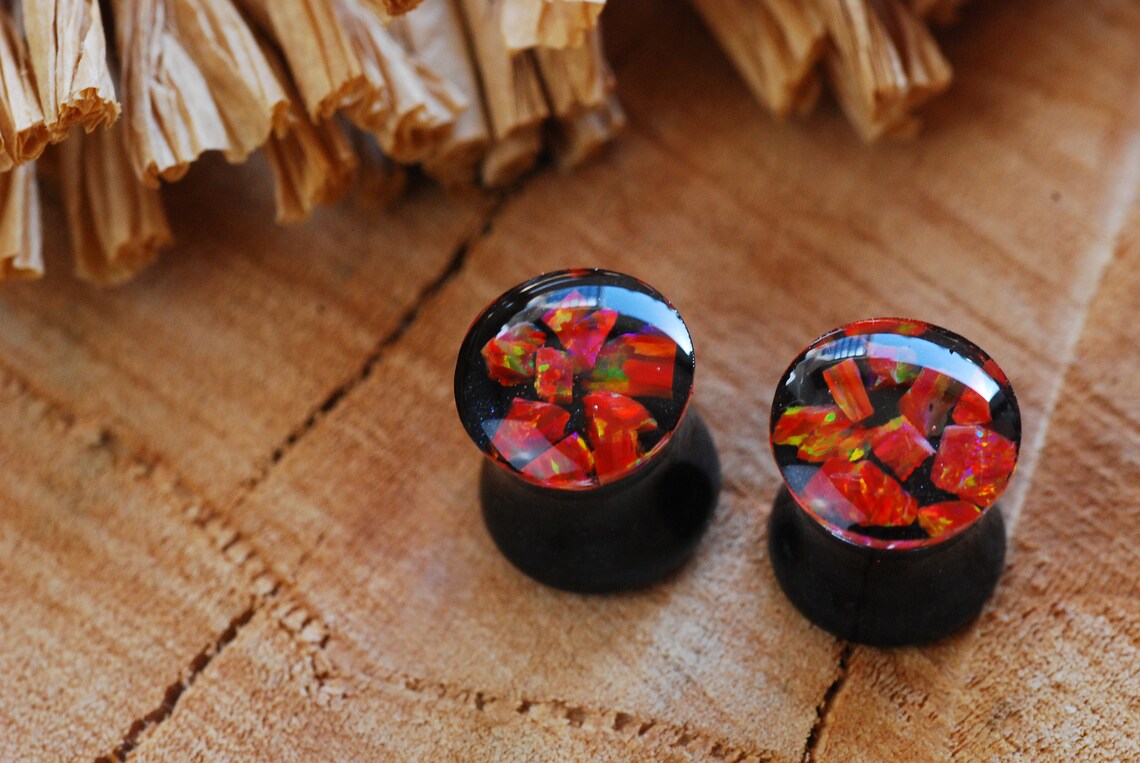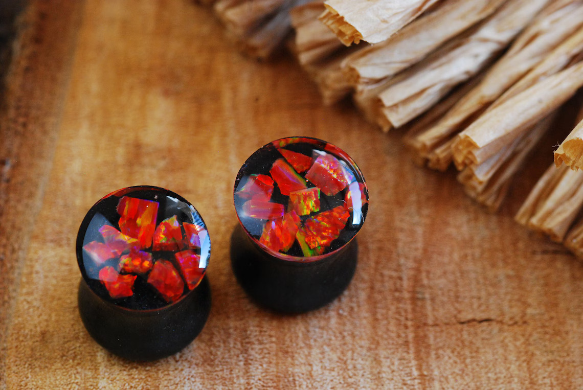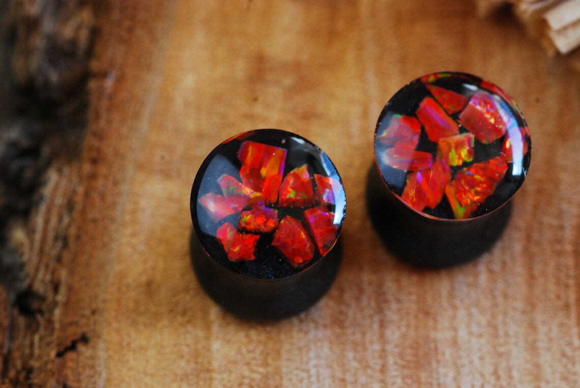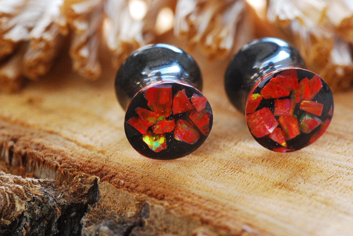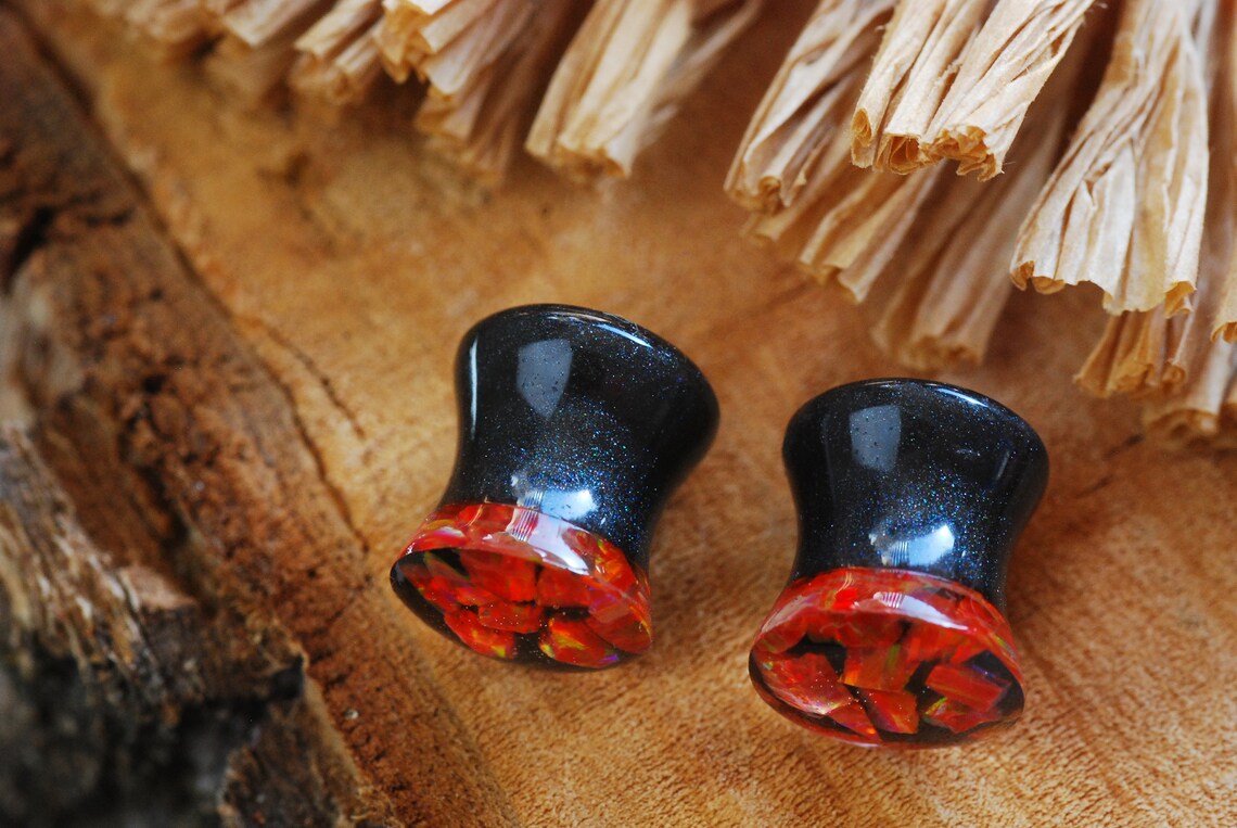 Beautiful and sparkly plugs made of black resin with a top layer of crushed opal.