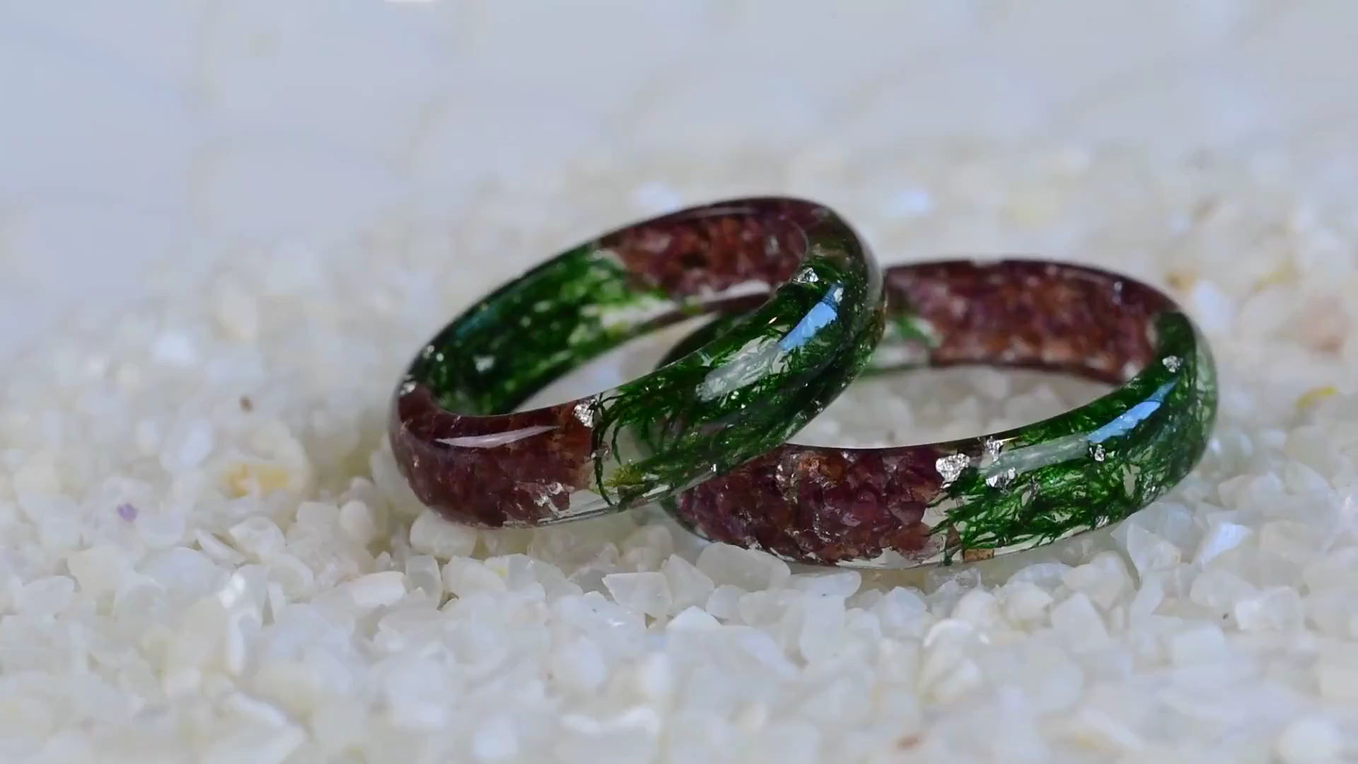 This unique garnet ring is made with garnet gemstones moss and metallic flakes of your choice.
