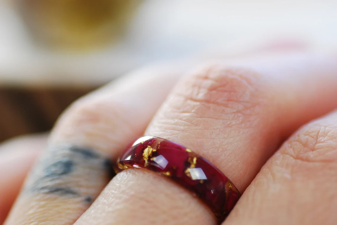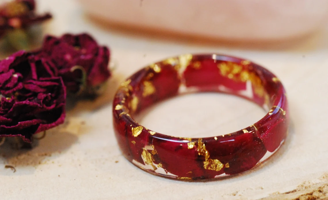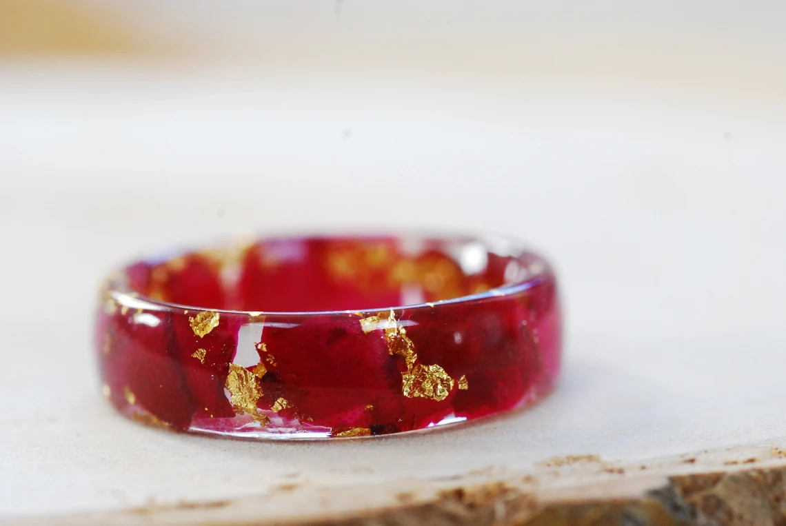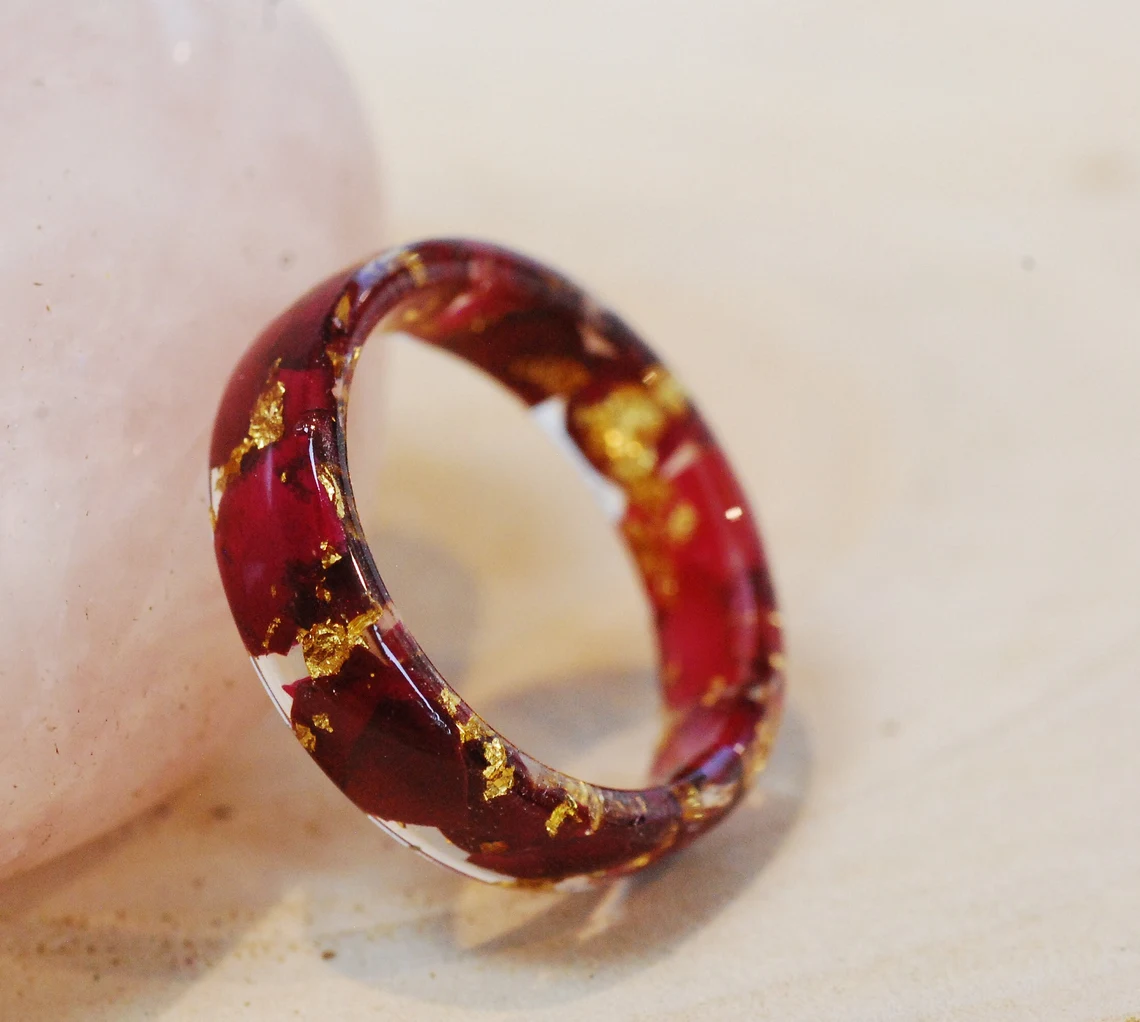 This romantic red rose petals ring is made with real preserved flowers and 24k gold flakes all set inside a thin and slightly flat clear resin ring.