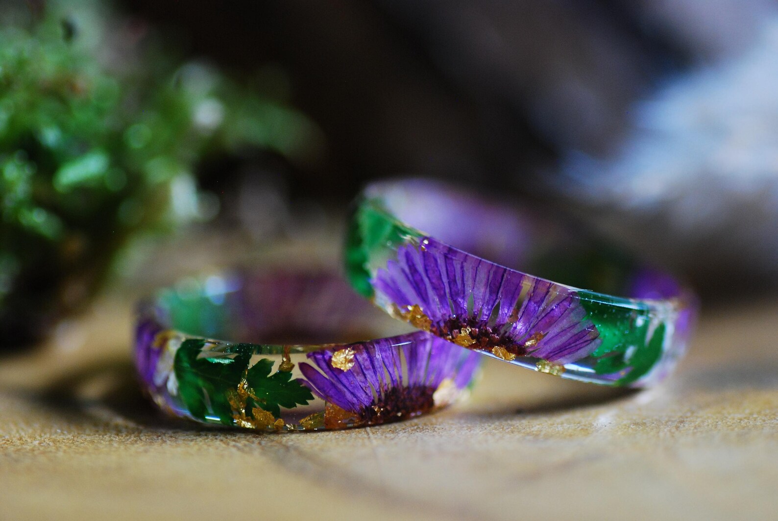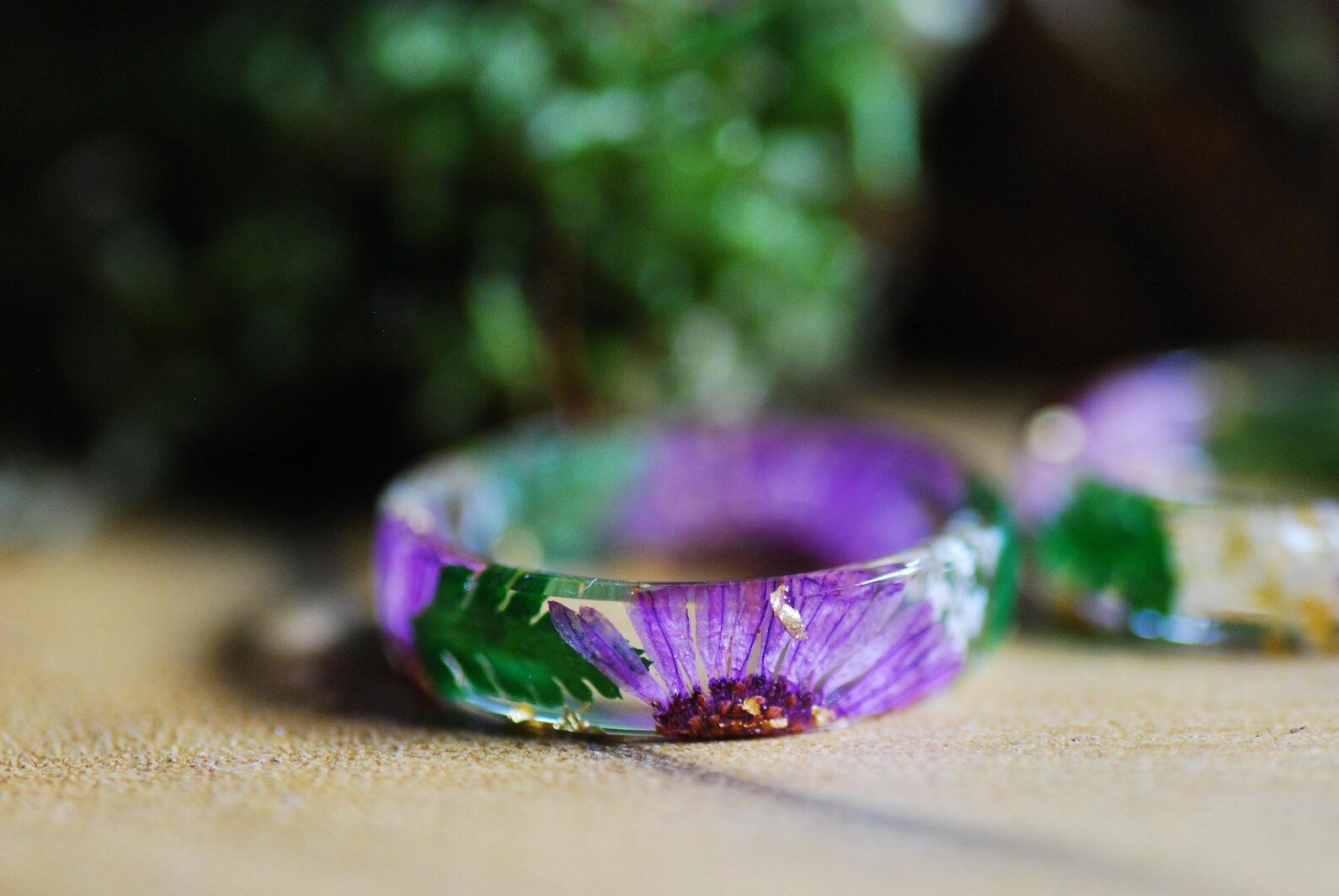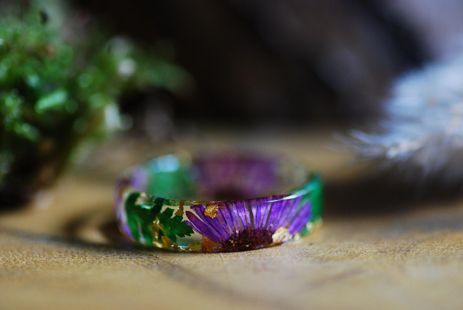 This bohemian September birth flower ring is handmade with high gloss clear resin and 24k gold flakes. This ring is very special because it features purple aster flowers, preserved green ferns, and tiny white flowers that we grow in our garden and harvest from the forest.