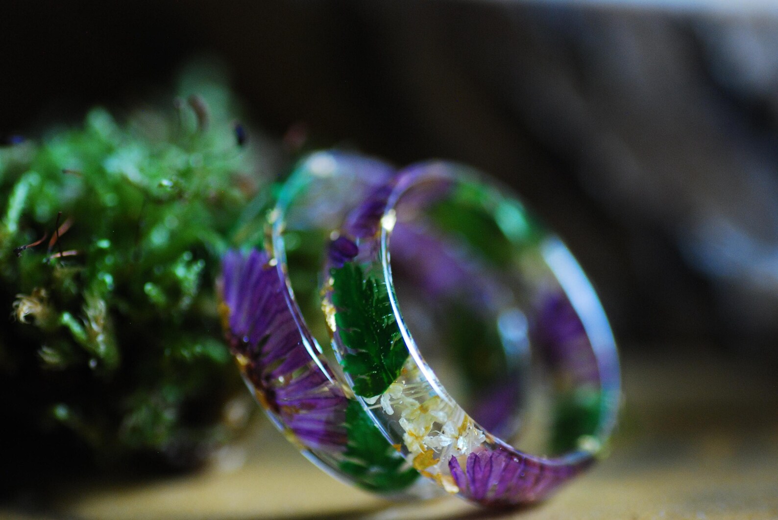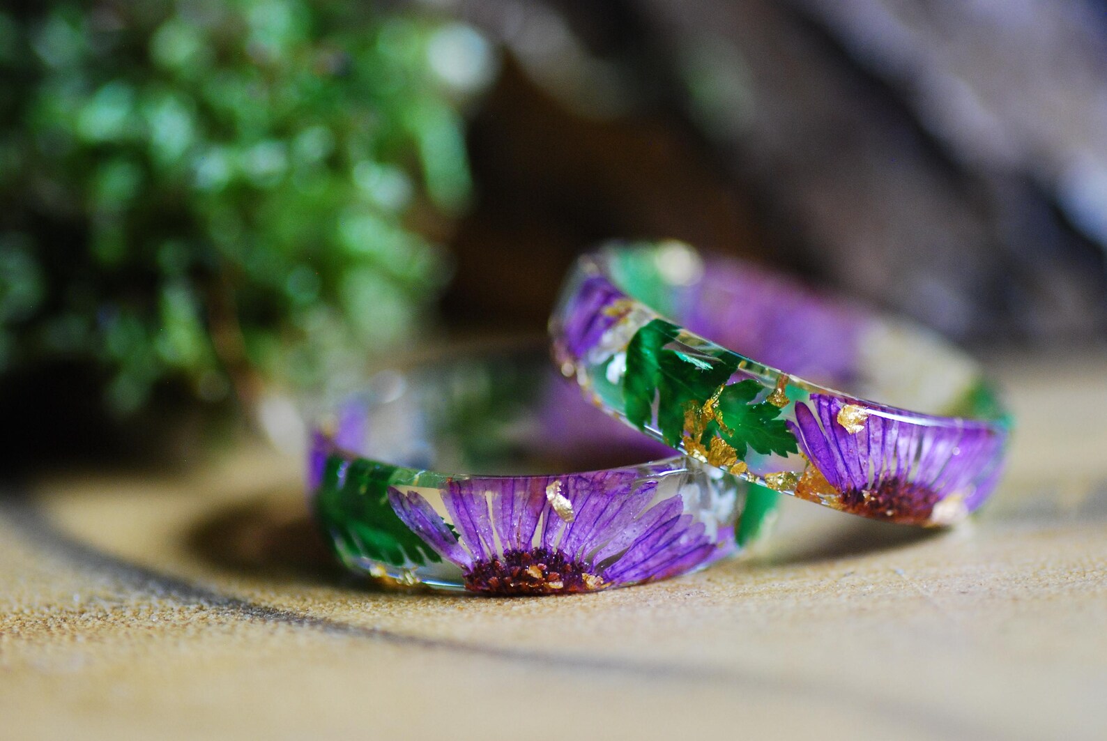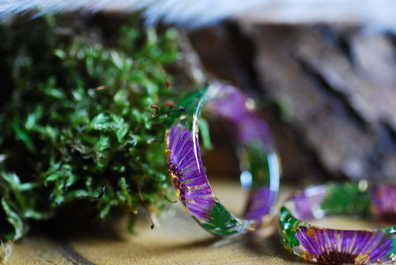 This bohemian September birth flower ring is handmade with high gloss clear resin and 24k gold flakes. This ring is very special because it features purple aster flowers, preserved green ferns, and tiny white flowers that we grow in our garden and harvest from the forest.
