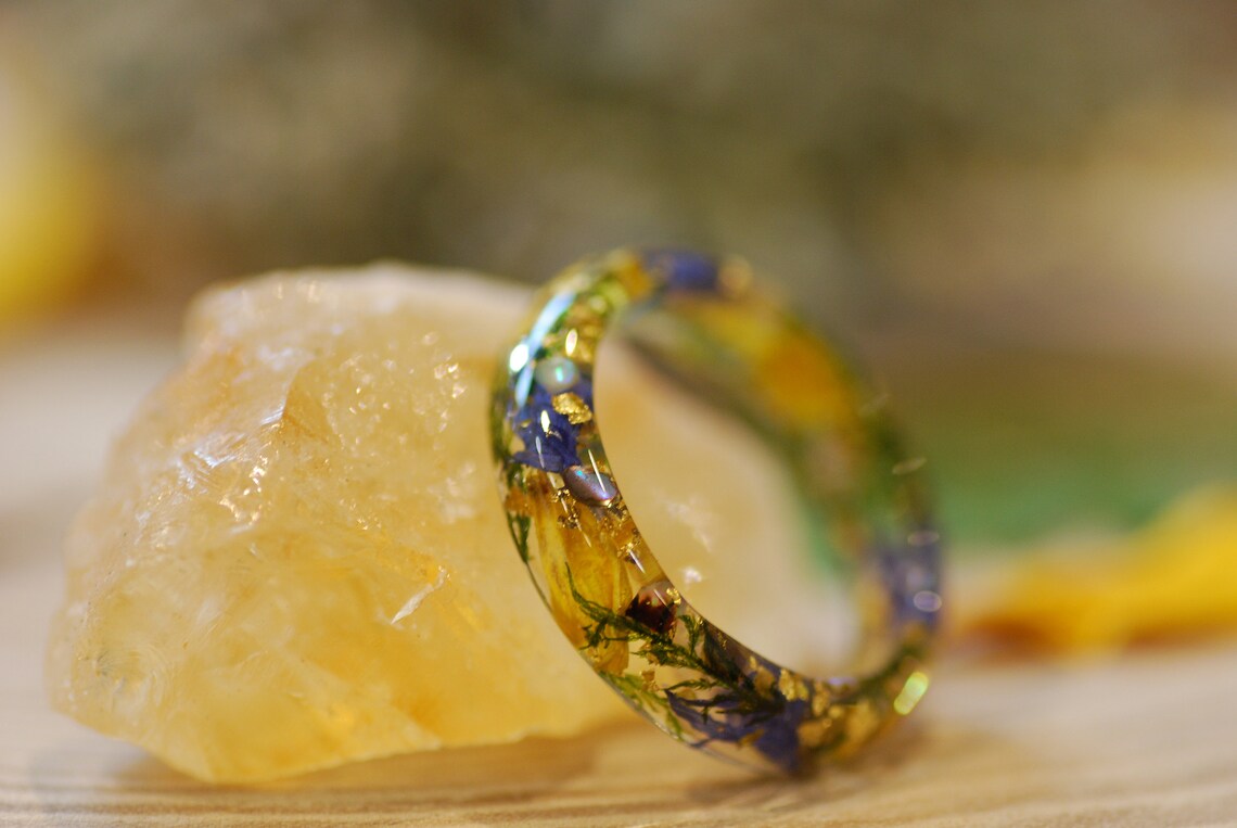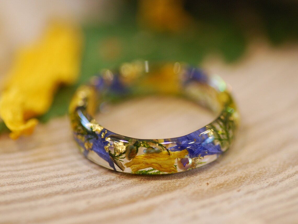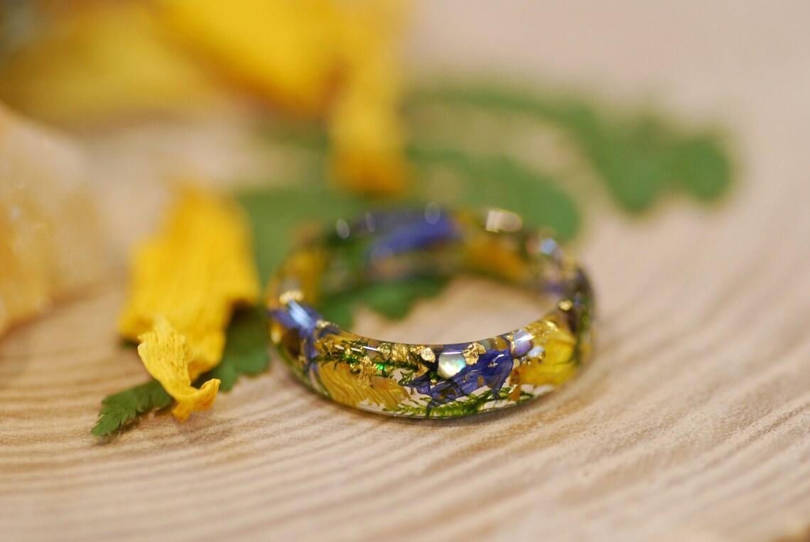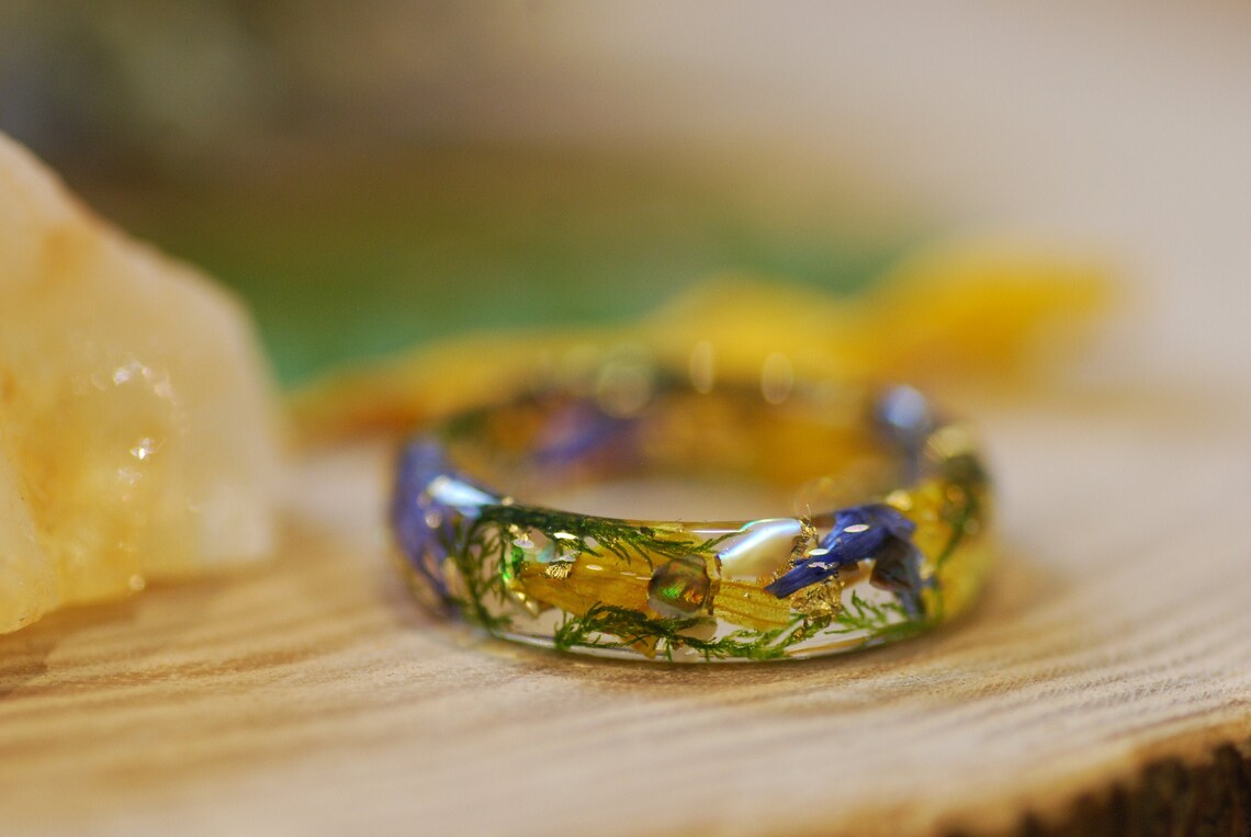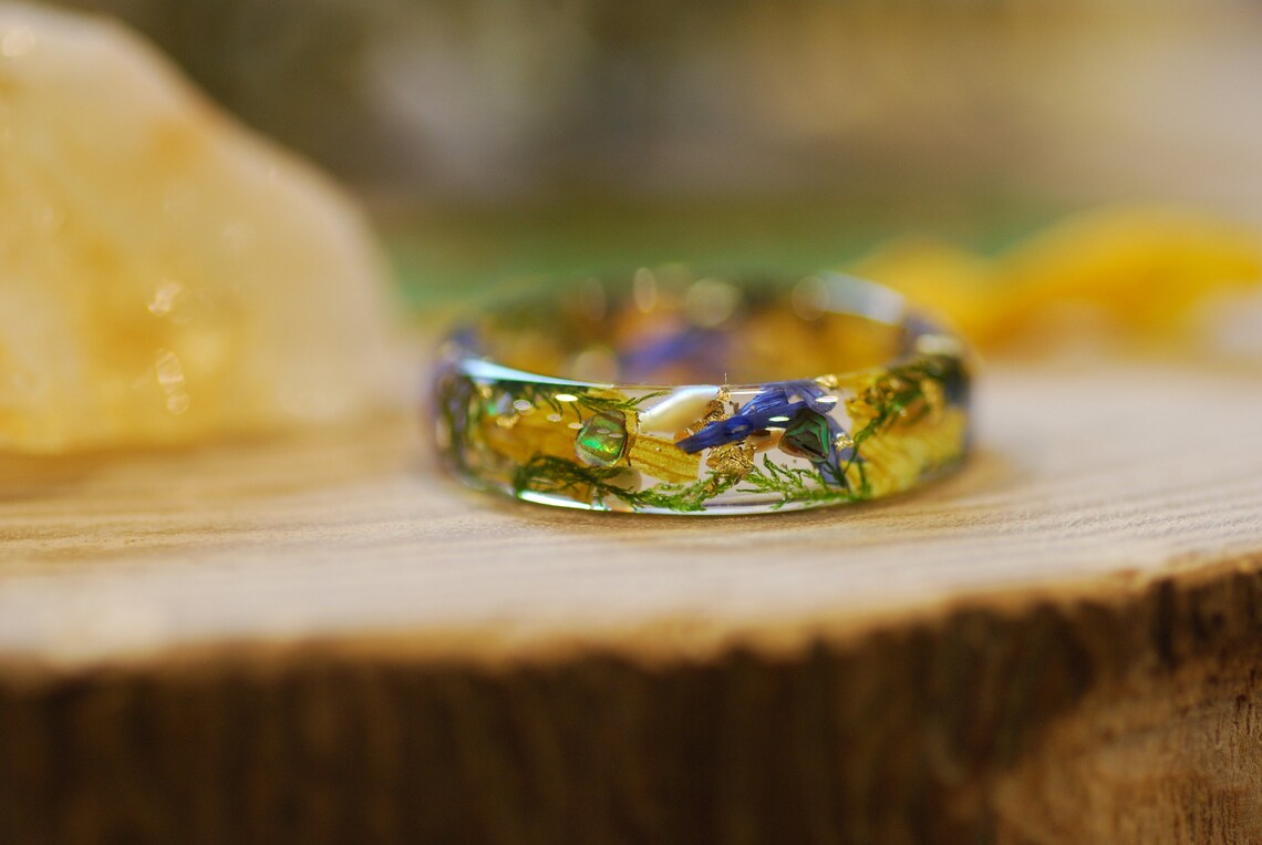 Handcrafted with real yellow sunflowers, blue cornflowers, and delicate green moss, this stunning ring also features 24k gold flakes and abalone crushed seashells, all artfully set in clear Eco resin.