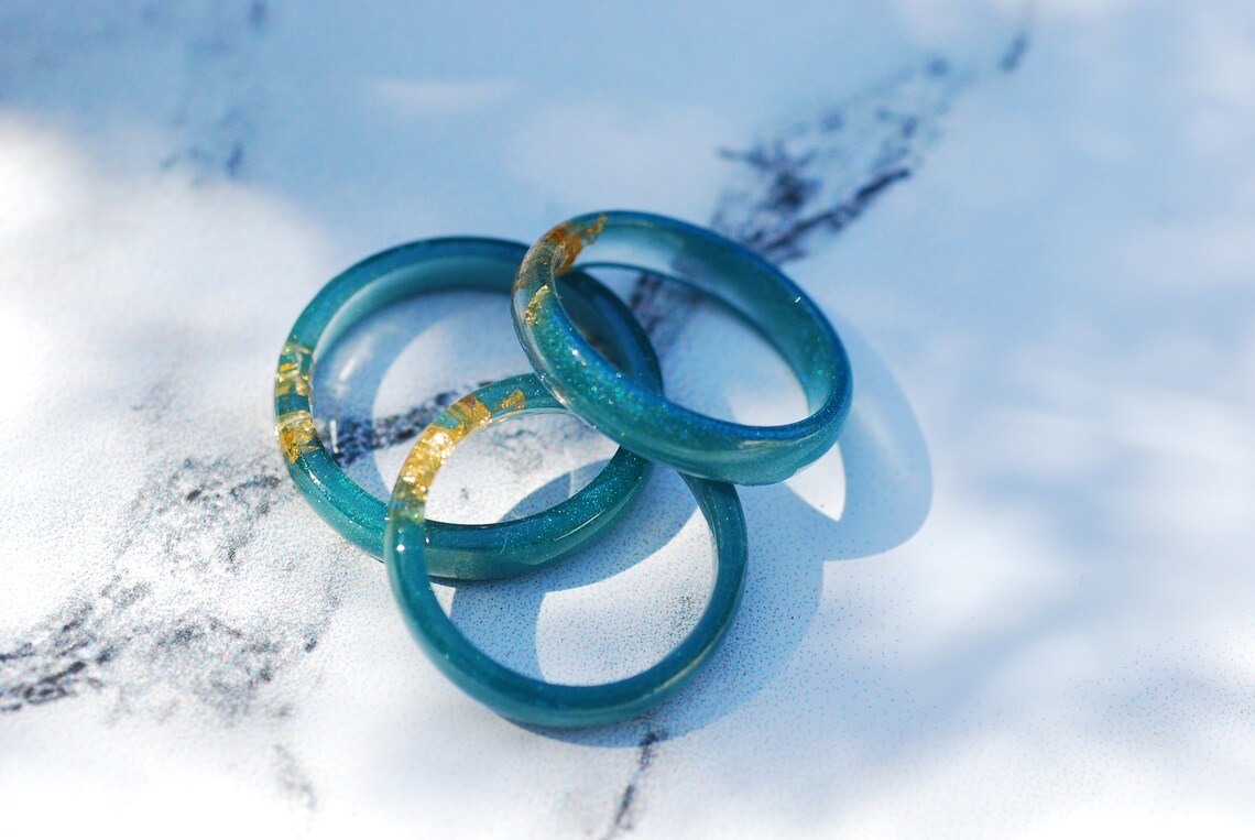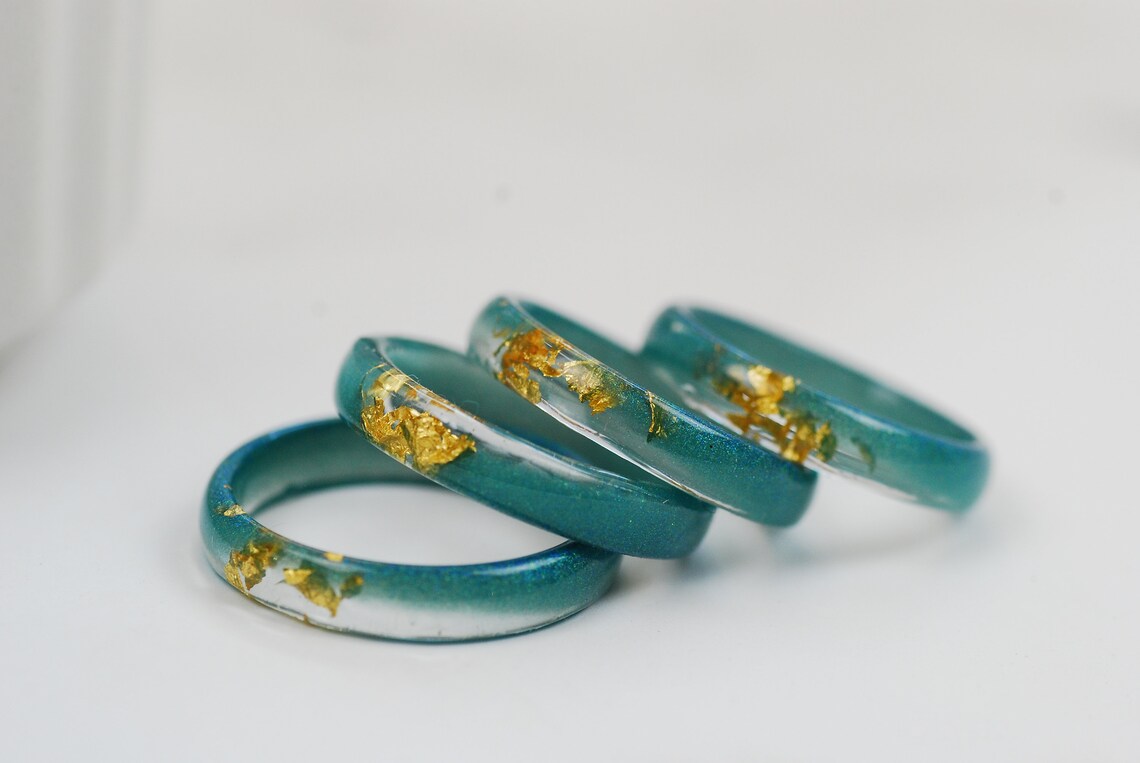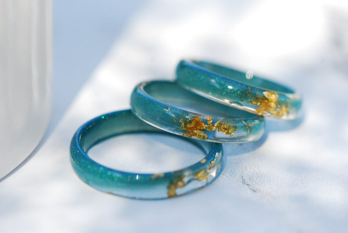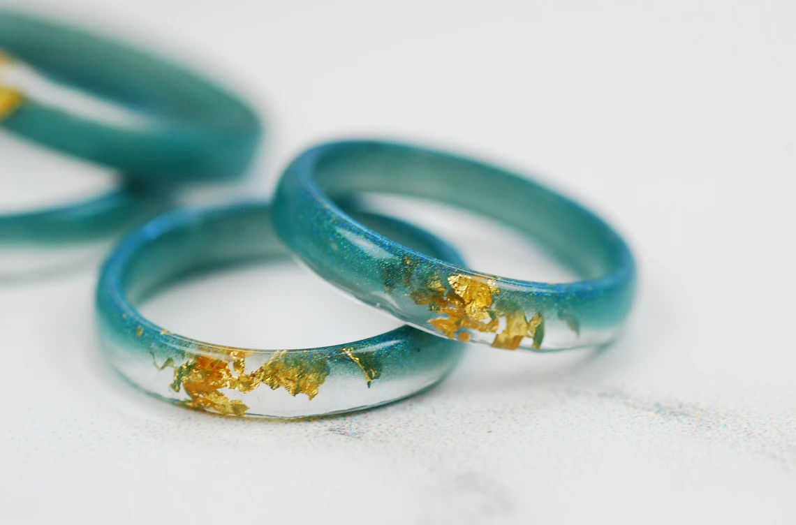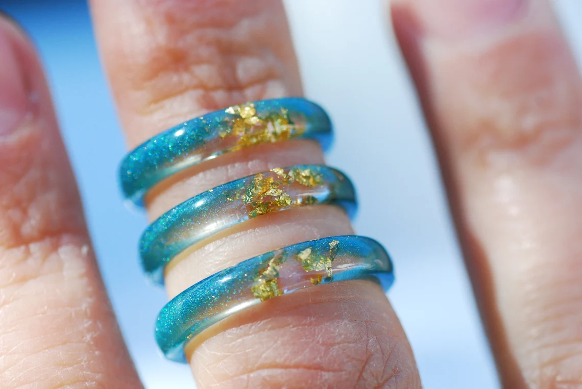 Each ring is unique, made with blue teal mica pigments and gold flakes suspended in the resin.