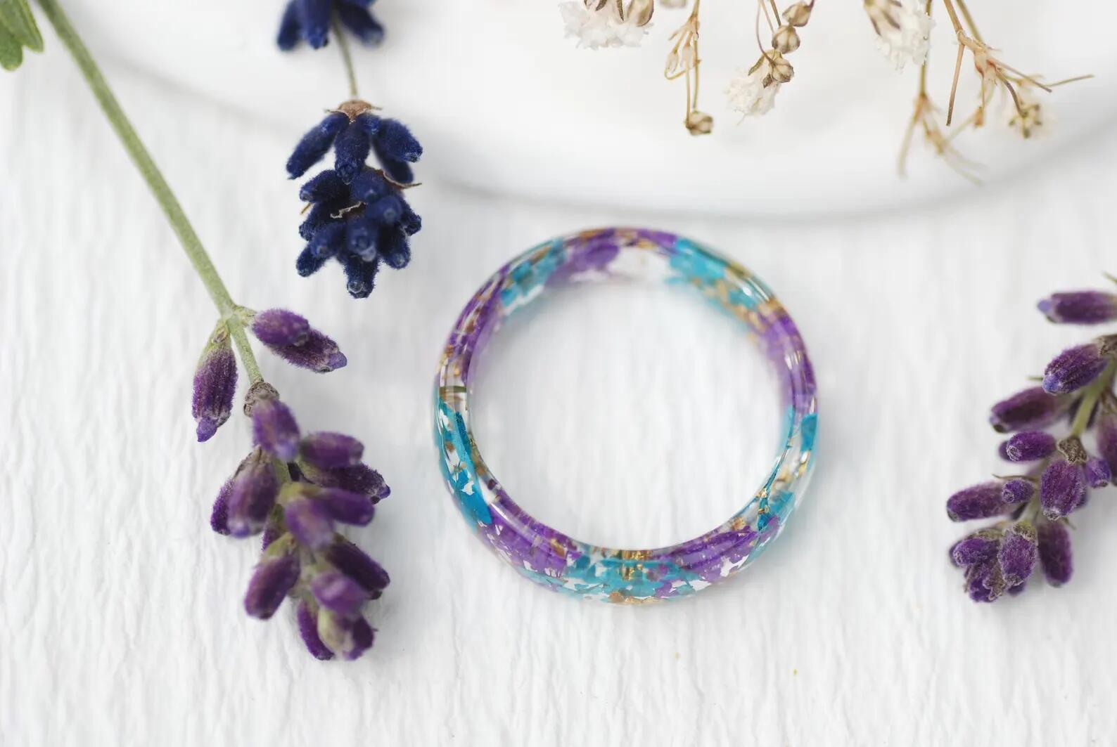 This stunning floral ring showcases preserved pressed flowers of violet and turquoise Queen Anne’s petals along with 24K gold flakes, all encased in clear Eco resin.
